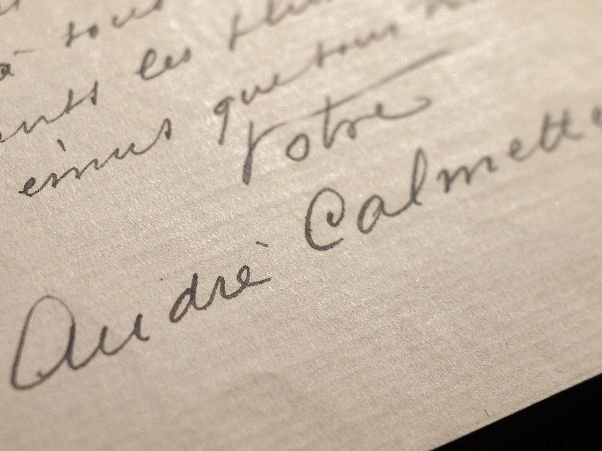 『ギーズ候の暗殺』(1908年)をシャルル・ル・バルジと共に共同監督したアンドレ・カルメットのサイン物2点。一点目は裏に手書きの献辞と署名を付した1890年頃のキャビネット写真。もうひとつは1913年、当時コメディア・イリュストレ誌に寄稿していた文筆家エルンスト・ラジュネス(Ernst La Jeunesse)氏に送った直筆書簡。