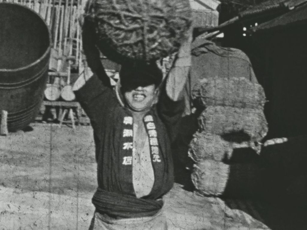 中盤、若い男性がおどけた表情を見せながら米俵を持ち上げています。袢纏の文字が読めそうですよね。右列は「○白菊醸造元」、左列は「○瀨本店」…。左列の一番最初の文字が判読できなかったのですが、別フィルム( 『昭和4年学生水上競技 於玉川プール』 )の最後に鉄筆手書きの「広瀬」とあったのをヒントにしていきます。「高浜」で酒の「醸造」を営む「広瀬本店」で撮影されたフィルムではないか…の予測を立てました。