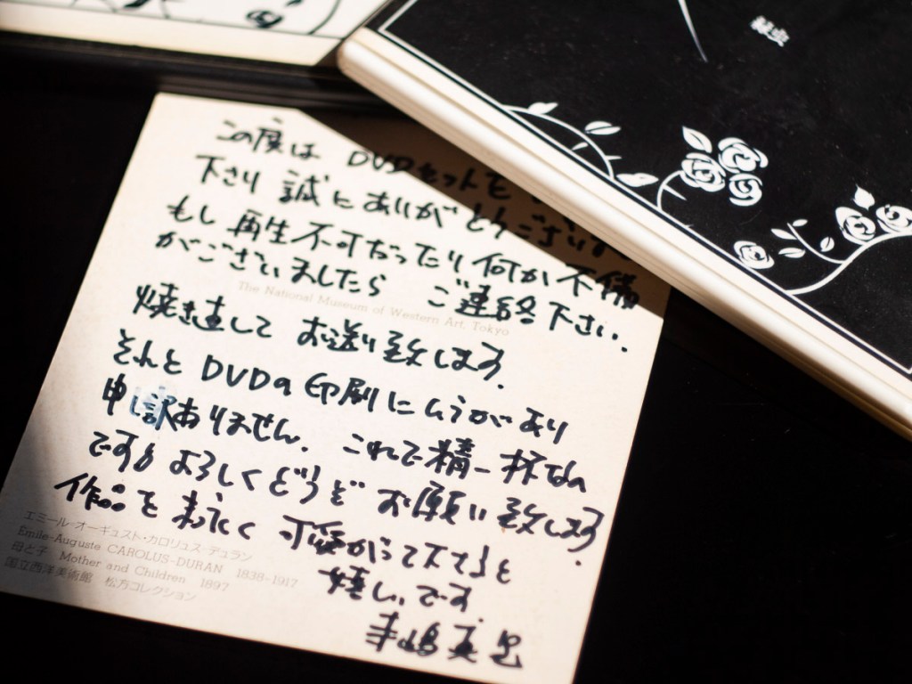 ちょうどこの時期(2011年頃)寺嶋監督は自身のHP経由で『作品集 Vol.1&2』を販売していました。スクリーンショットからでも優れた作品集だと分かったのでためらわずに購入。すると翌日監督本人からお電話がありました。「勝手に複製してネットで頒布したりしないで下さいね」。その後送られてきたDVD-Rは丁寧な直筆メッセージ付き。電話、手書きメッセージどちらからも自身の作品をとても大事にしている、そして大事にしてほしいと願っている様子が伝わってきました。
