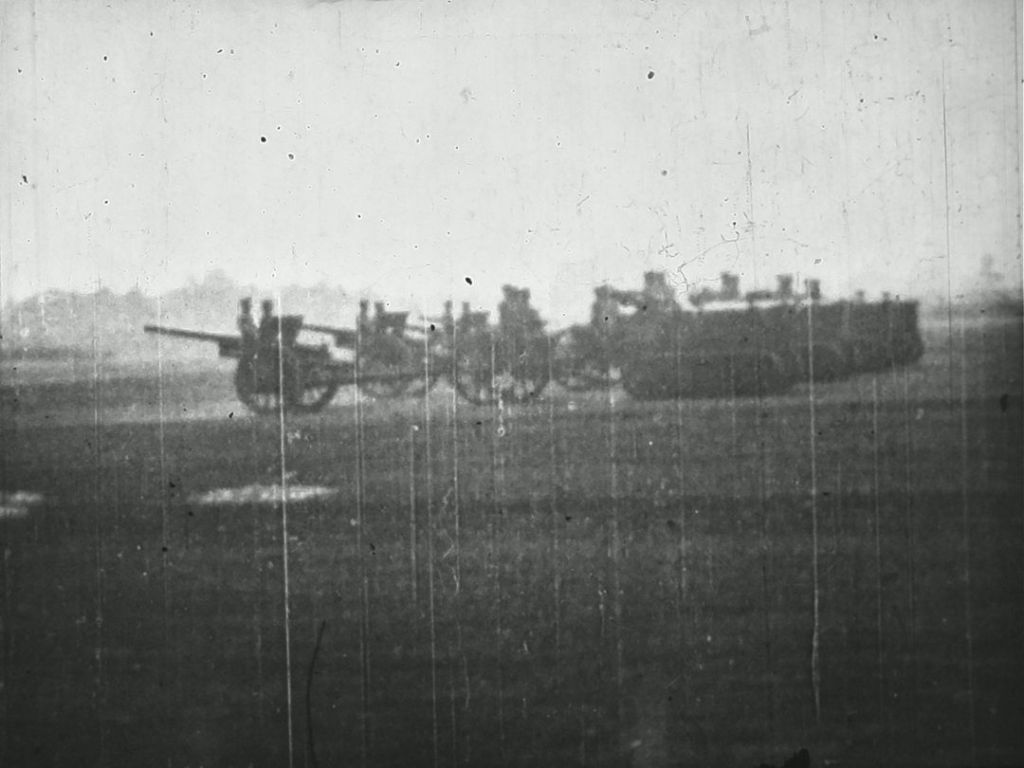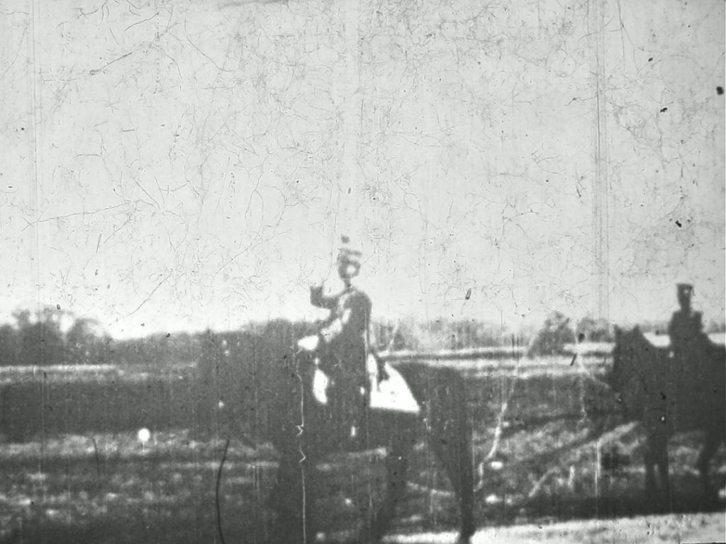 昭和3年(1928年)4月29日、天長節(天皇誕生日)に行われた陸軍観兵式の模様を収めた20メートル物。冒頭を中心に一部画像が流れており汚れの目立つ状態でした。