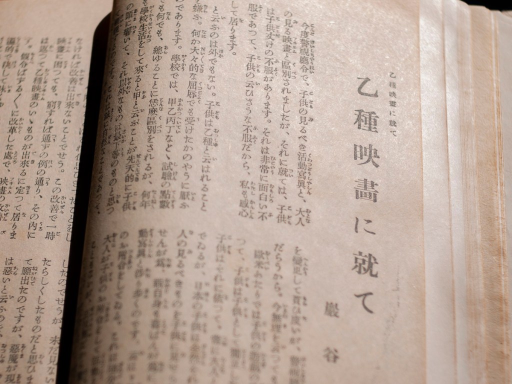 当時の映画界で大きな問題となっていた「検閲」については、論考二つ(「乙種映畫に就て」「活動寫眞に就て」)で一般論を語り、もう二つの記事(「不合格となつた乙種映畫」「活動寫眞檢閲場を觀る」)で具体例を挙げていきます。