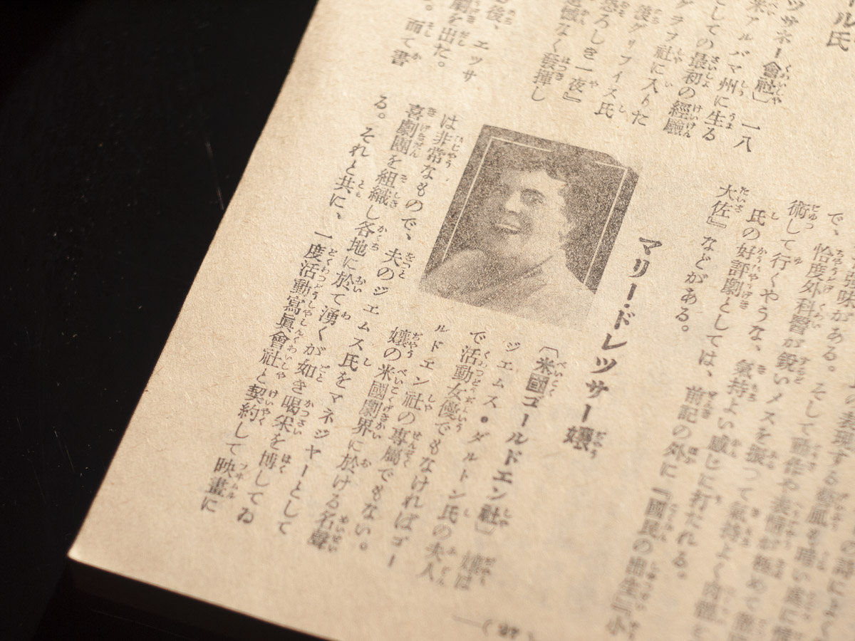 また、表紙・グラビア・作品紹介・俳優紹介・読み物での扱いで分かるようにビリー・バーク主演の『グロリア物語』を大々的にフィーチャーしつつ、旧劇(連鎖劇)の市川海老十郎、女優として頭角を現しつつあった木下百合子の二人を複数誌面で扱い読者の関心を促しています。