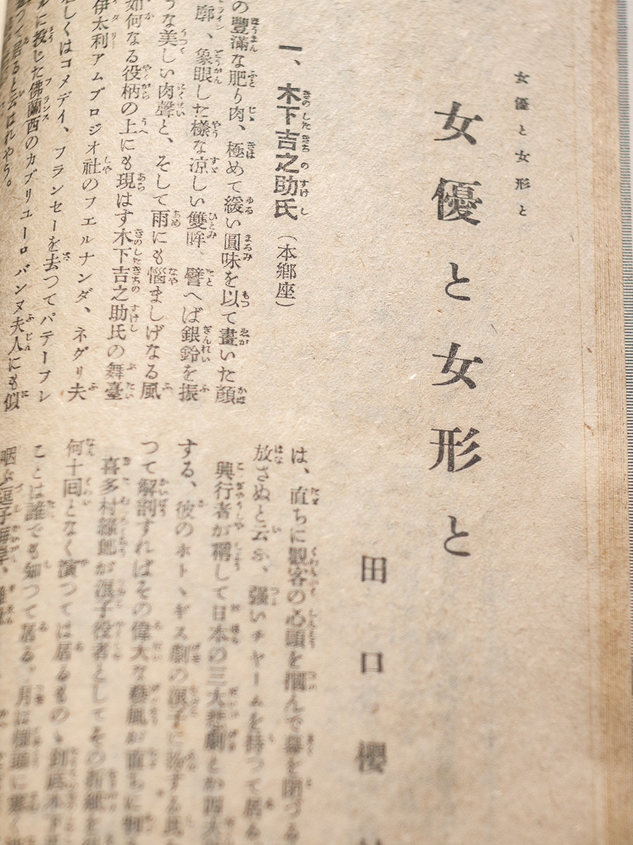 また雑誌後半には邦画俳優からの寄稿が二つ(澤村四郎五郎が現場の苦労を綴った「日暮里撮影所にて」、木下百合子が関西旅行時の雑感を述べた「諏訪町より」)が含まれていました。四郎五郎の文章は作品から受けるイメージと違い内向きな穏やかさがあって面白かったです。