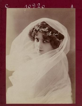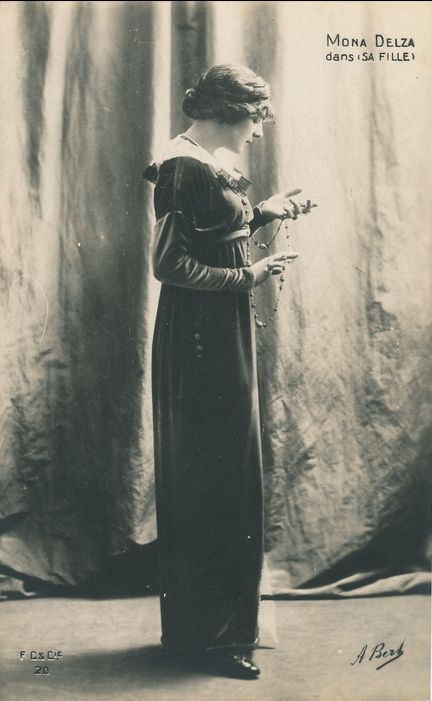 1910年の舞台劇『狂へる処女(La Vierge Folle)』の主役で当たりを取り、第一次大戦前~戦中期に人気を博した女優さん。この時期のフランスでは卵型の面立ち、垂れ目気味のおっとりした雰囲気の女優(ガブリエル・ロビンヌ、ユゲット・デュフロ)にアイドル的な人気がありました。モンナ・デルザも同系統に属しており、正直、正面姿だけでは他女優と区別しにくいです。ところが首筋の細さ、頭の形、ふわっとした髪型で構成されるシルエットが独特で、斜めから角度を付けると見え方が全然変わります。