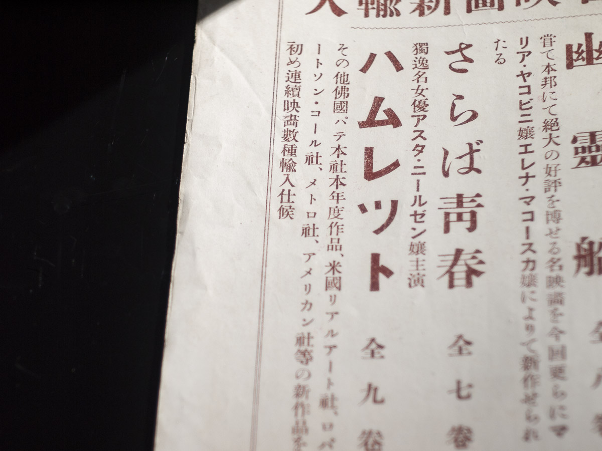 ちなみに表紙をめくったページには國活の輸入作品の広告あり。以前にDVDを紹介したアスタ・ニールセン主演の『女ハムレット』、マリア・ヤコビニ主演の『さらば青春』が並んでいます。大正10年7~8月は米国作品の公開数が圧倒的に多く、活動画報もハリウッド特集号の様相を呈しているのですが、5月には『カリガリ博士』『アルゴール』が紹介されており、年末にかけて『蛇身の舞』(10月6日公開)、ルビッチの『ドール/花嫁人形』(11月9日公開)等が紹介されていきます。ハリウッド一強が崩れより多彩、複雑に展開していく1920年代の激動を前に一瞬水面が凪いだような一冊でした。