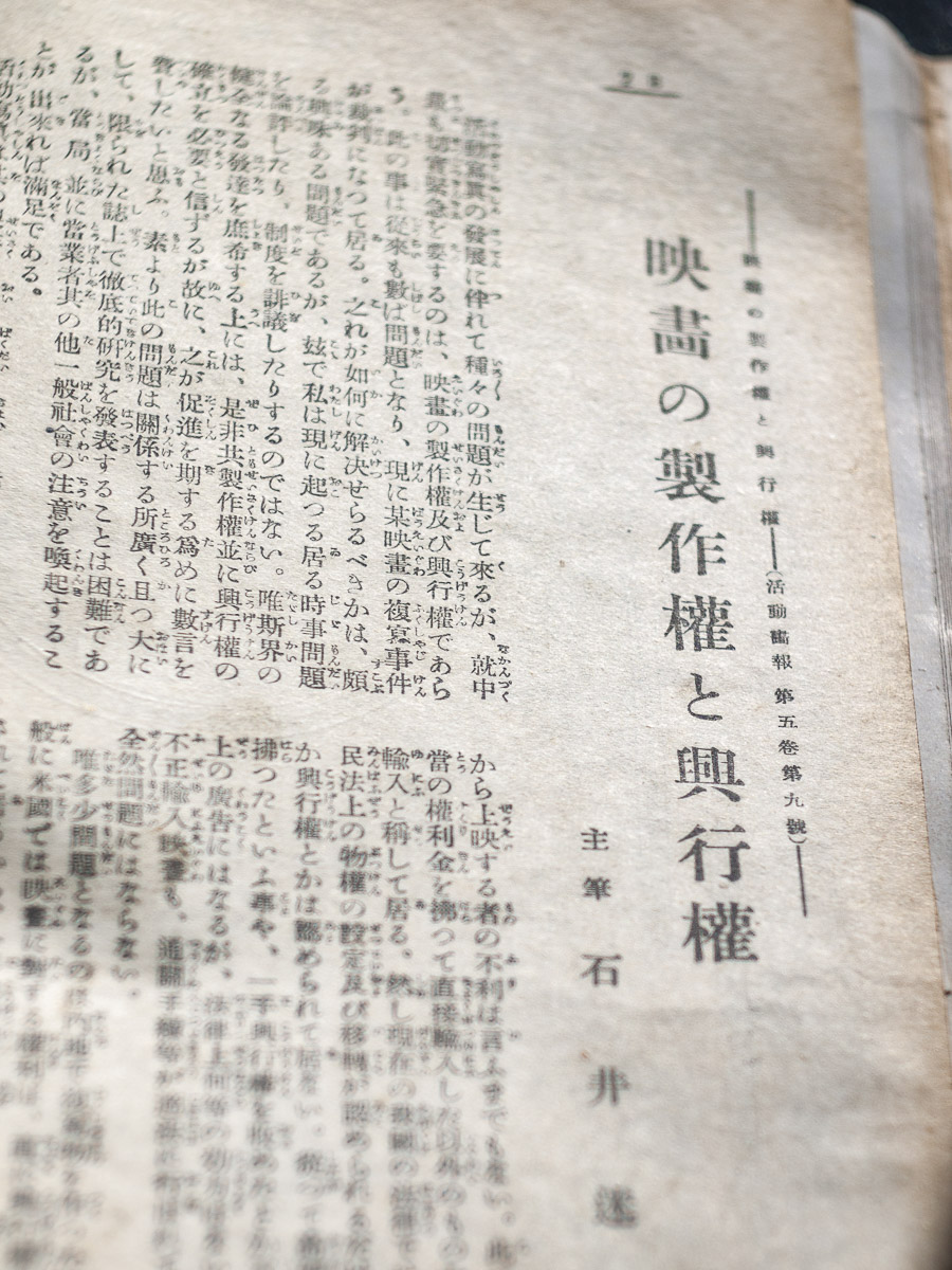 論考では活動画報の主幹・石井迷花氏による「映畫の製作權と興行權」が優れた内容でした。本サイトの投稿で言うと「フイルムの行衛」(森田 淸、『キネマ・レコード』大正4年6月 通巻第24号)や「盗まれたフィルム」に関わってくる話で「活動寫眞が著作權法に依つて保護さるべきもの」の考え方が業界に徹底されるよう提言しています。正規の製作会社のルート以外で入手したフィルムを上映していた(不正輸入)一件など、他ではなかなか聞けない裏話が含まれています。