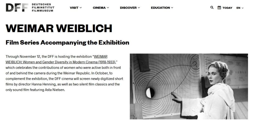 今年(2023年)の3月から12月にかけ、DFF(ドイツ映画博物館)で「ワイマール共和国の女:ドイツ近代映画(1918-32)に於ける女性とジェンダー多様性」というイベントが開催されています。この企画はドイツにおける女性映画監督の先駆けハンナ・ヘニング(Hanna Henning、1884–1925)作品の上映プログラムを含んでいる点で興味深いものです。