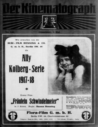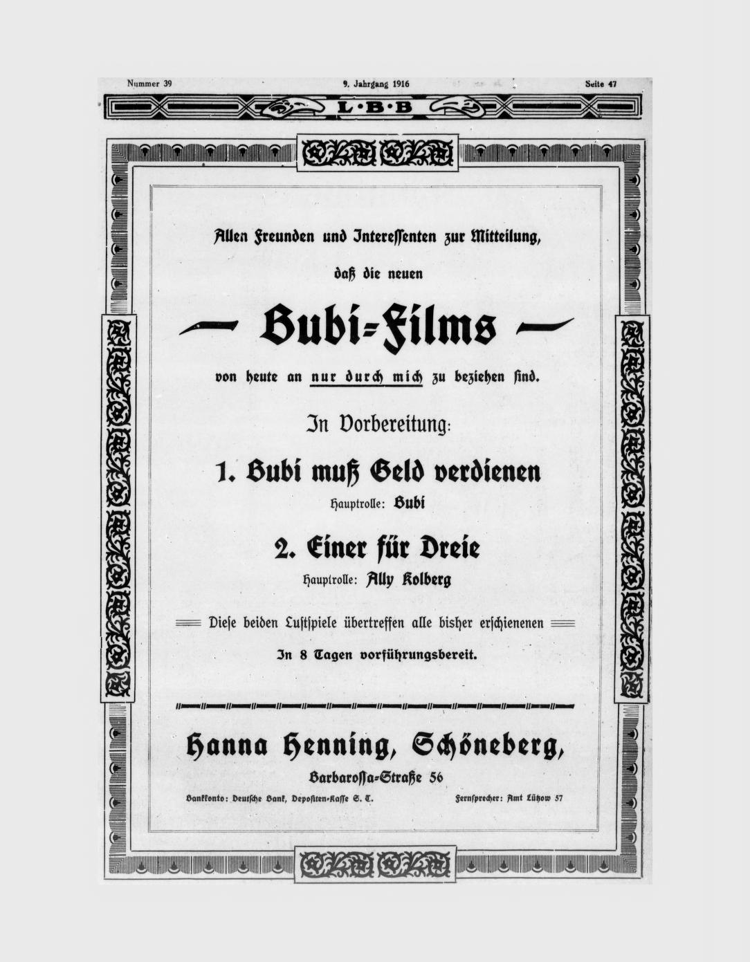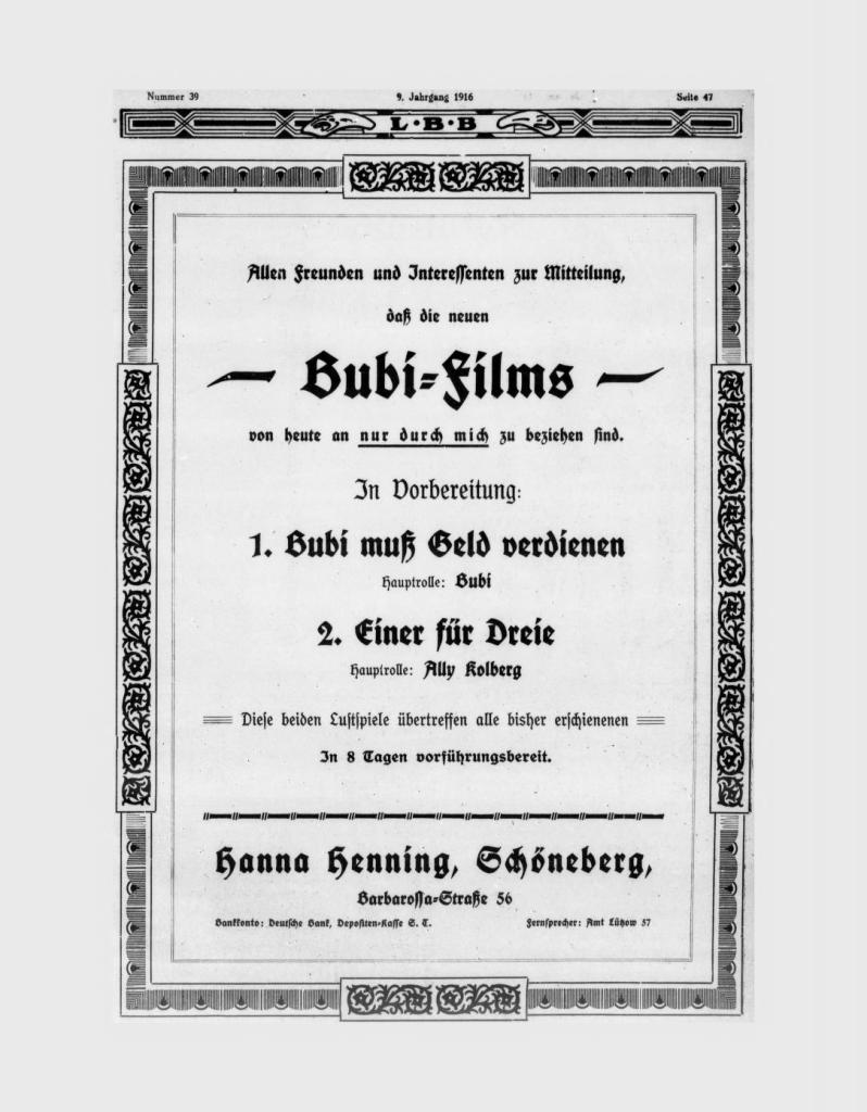 このドイツ版ブビ君(Bubi)喜劇の仕掛人がハンナ・ヘニングでした。1915年末、「ブビ映画」の名を冠した第一弾『叔父さんの遺産(Onkels Erbe)』公開。当時の広告をみると二行目に監督ヘニングの名前を見て取れます。また、この作品は彼女にとっての監督デビュー作でもありました。国外作品の輸入が途切れた一瞬、隙間産業のビジネスチャンスを捉えて業界に参入したと見ることもできます。