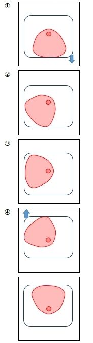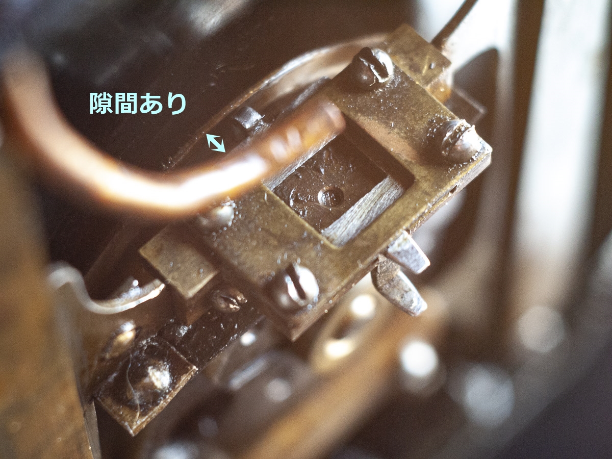 問題はここからなのです。フィルムの送りの鉤爪は、上下動だけではなく前後への移動と連動し、楕円形の動きを成すことでフィルムを下へと掻き下ろしていきます。この前後移動を生み出すのがおにぎり型のギアに併設された段差機構でした。エクラ映写機でもこのシステムが採用されており、鉤爪パーツの突起がせり出した段差の部分では押し出されて映写機の外側に飛び出し、段差の押しこまれた部分では内側に引っ張られてフィルムから離れ引っ込む形になって…いませんでした。