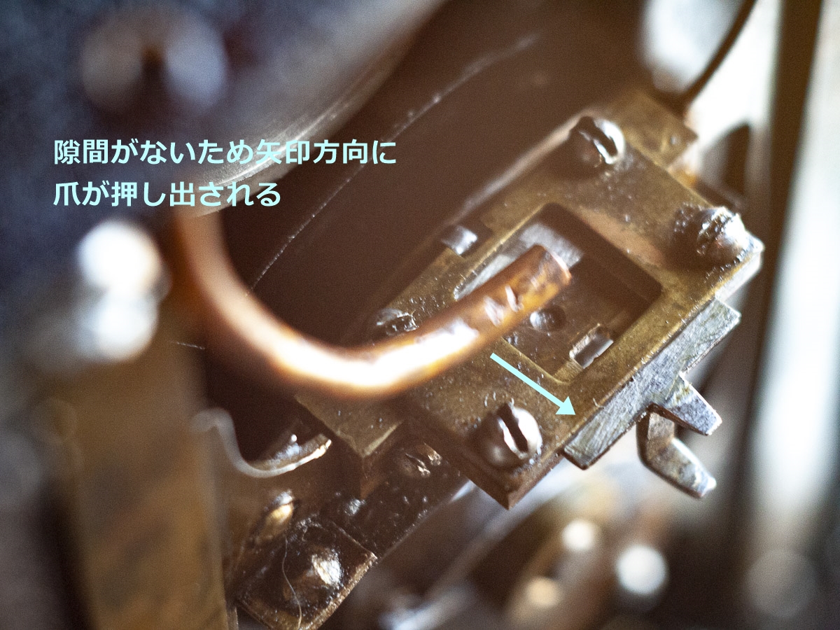 パテベビー映写機だと、本来この部分にはスプリングが噛ませてあって鉤爪が映写機内側(写真右の黄色矢印)に戻ります。そういった仕組みが見当たりません。鉤爪が外に向けて出るものの、その後引っこまずに出っぱなしになってしまいます。これだと上手くフィルムを送ることができません。