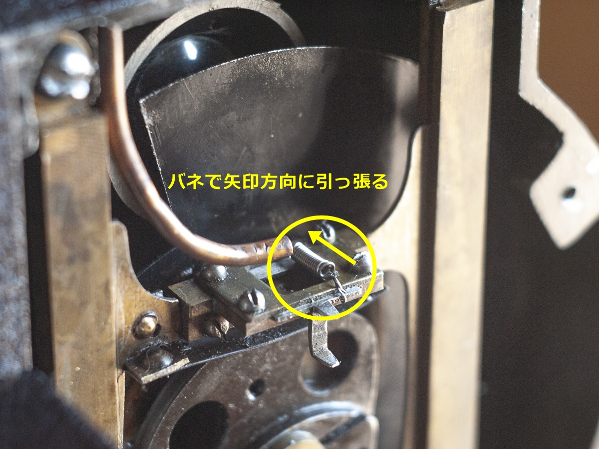 思案のしどころです。エクラ映写機(あるいはそのベースとなったパテ・ルーラル映写機)のこの部分を紹介・説明している人はいないため自力で何とかしていかないといけません。部品取りで残しておいた小さなパーツからスプリングを取り出し、鉤爪に引っかかる形にしてみました。