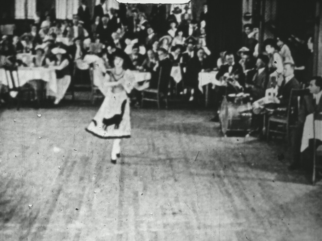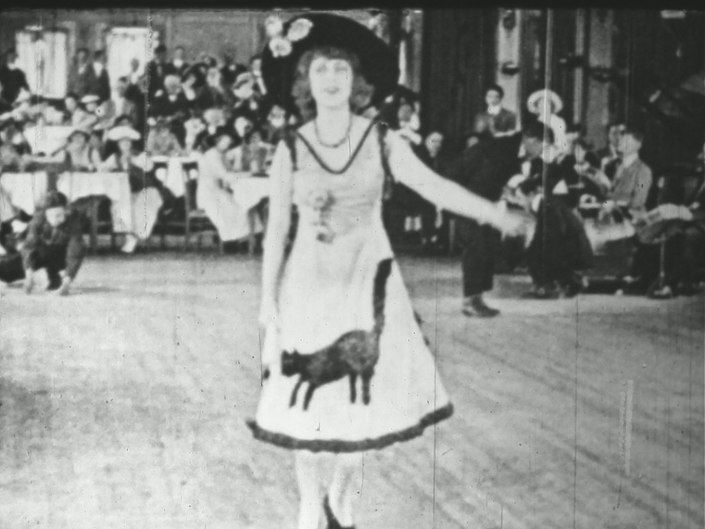 ミュージック・ホールでデビューしたばかりのヒロインが歌と踊りで観衆を沸かせるも、たまたまドレスにあしらっていた猫のデザインが犬の目に留まり、追い駆けられて客席に逃げ込んだところを男性客に助けられる…