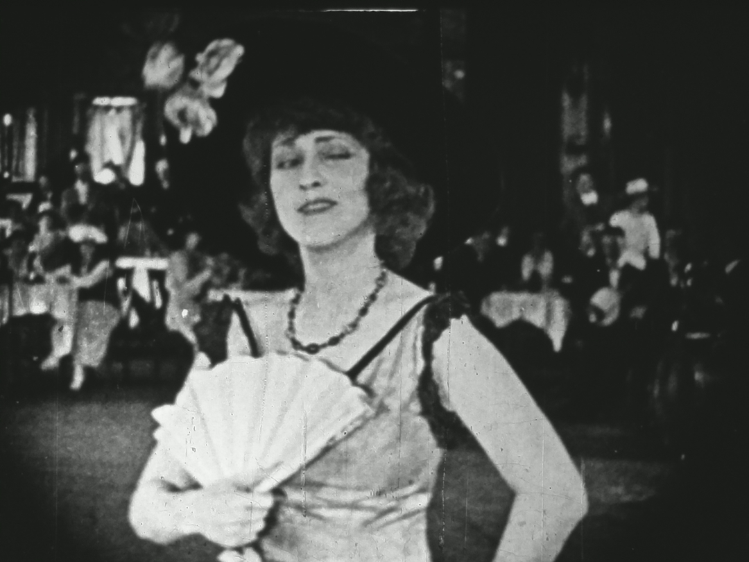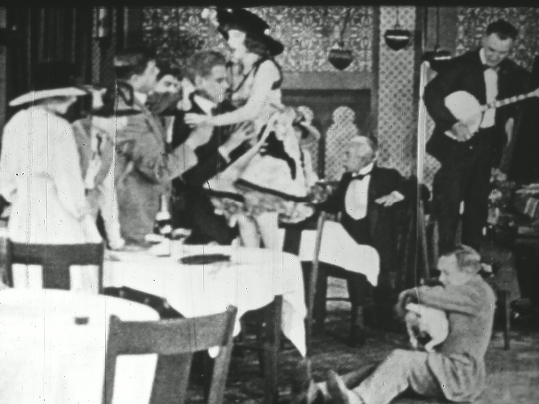 『突風』の物語はエレーヌ(ファニー・ワード)、男爵(ジャン・ジョッフル)とロベール(ジャン・ダクス)の悲劇的な三角関係を描いていきます。9.5ミリ版はエレーヌと男爵が知りあう場面を切り取って独立したコミカルな寸劇に編集。原作戯曲には含まれていない独自場面のため、この断章だけを見ていても元作品は分かりません。そのため国外の研究者も出典を特定できないままになっていました。
