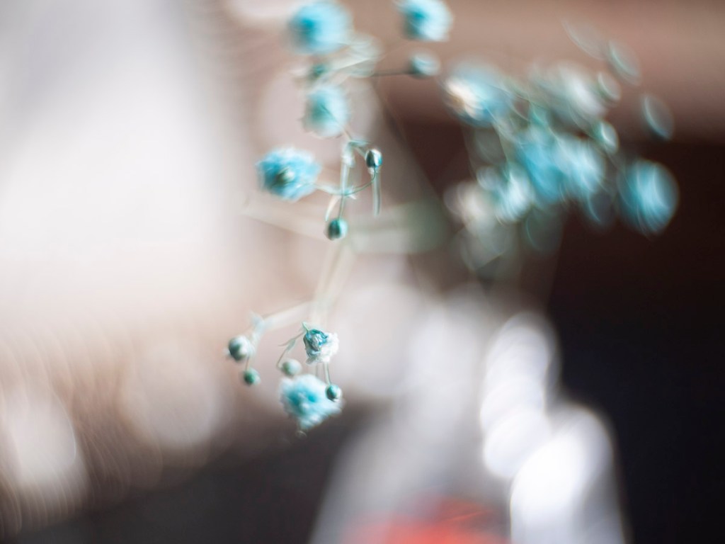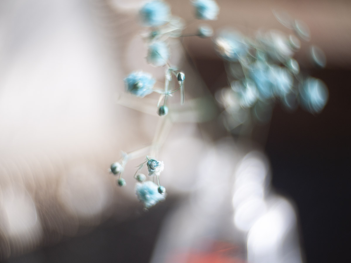 ほぼ中心、カスミソウの花にピントを合わせたものです。被写体深度が極端に浅く、中央から少し外れた部分にすぐボケが発生し始めています。描写としてはメイヤー・ゲルリッツのキノン・スーペリアーに近いタイプ。ただしキノン・スーペリアーではピントが合っている部分の範囲が広く、レンズの周辺部にのみ強いグルグルボケが出ていました。今回のキプターではグルグルボケの範囲が広く映写時に映像の左右が大きく乱れる形になります。