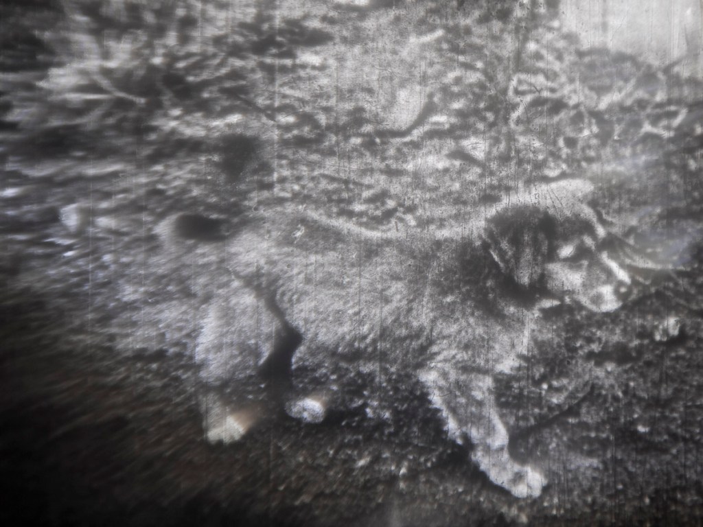 実際に9.5ミリフィルムを映写した際のサンプル。犬の頭〜前足〜背中辺りにピントをあわせたもので、この部分だけ見ると解像度、再現度の高い優秀なアウトプット。しかし画像の左1/3はピントが外れて流れてしまっています。