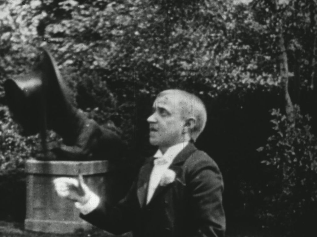 緑の多い公園の一角のような空間、左の端に丸テーブルが設置され助手が手伝いをしています。画面中央に燕尾服+シルクハット+ステッキ姿の小柄な男性。「ピュグメオ氏は32歳、身長わずか95センチ」の字幕。シルクハットを取って一礼すると胸ポケットから葉巻を取り出し、マッチで火をつけます。そのままシルクハット、ステッキ、葉巻を使ってジャグリングを披露。宙でクルクルッと回転した葉巻をぱくりと咥えます。