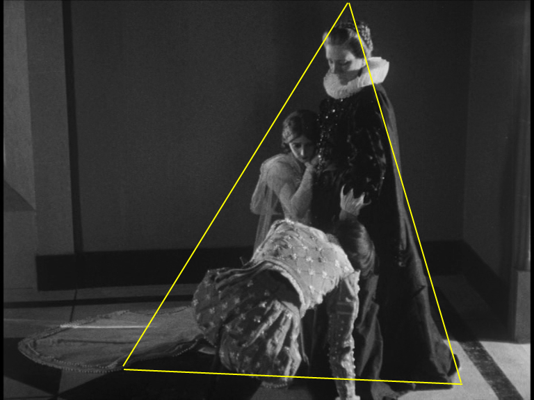 また直立した伯爵夫人、縋りつくイザベルとそのドレスが組みあわさって三角形の構図となるよう配置が工夫されています。キリスト教の図像学(イコノグラフィー)でなじみ深い、聖母子像や聖家族像で頻繁に使用されてきたデザインです。16世紀半ばの宗教戦争を背景とした作品の見せ場でこの構図は強いインパクトを与えるものです。