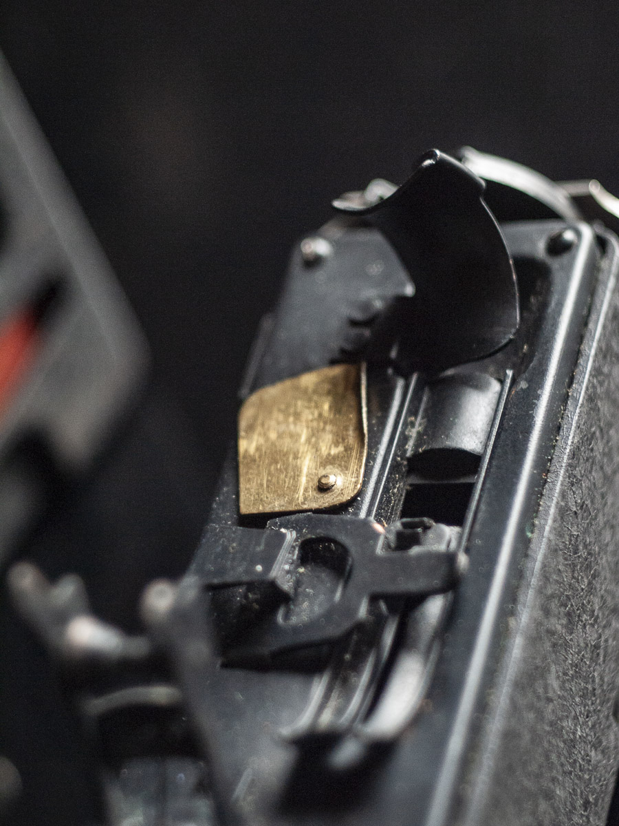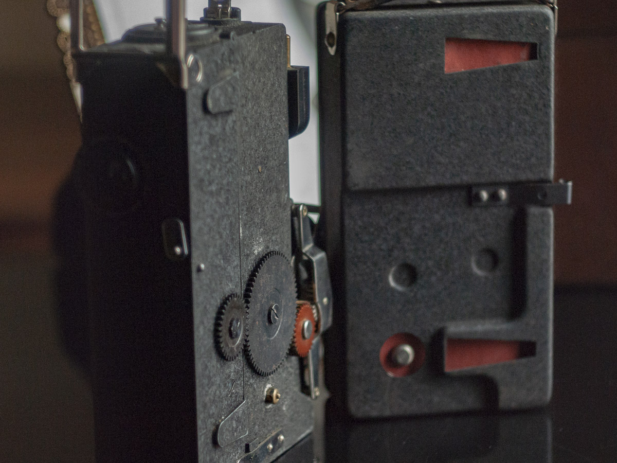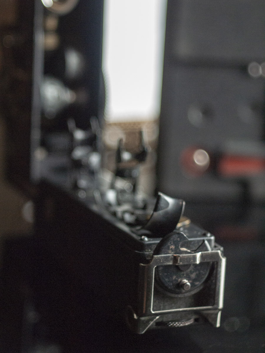 先に触れたようにフィルムケースが背後に外付けになっています。フィルム送りと受けが隣で並ぶ形になっており、フィルムは機体内で下から上へと掻き上げられていき、撮影が完了すると上から下に引き下げられ受け用のケースに戻っていきます。また機体内には映写用のランプが置かれています。背後にあったコンセントはこのランプにつながっているものです。