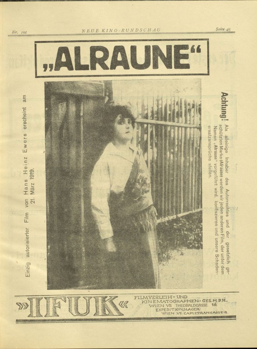1910年代ドイツ映画とその近辺では人造人間に対する一定の関心が見られました。1915年版の『巨人ゴーレム』を皮切りとし、1916年にはオットー・リッペルト監督による連続劇『ホムンクルス』公開。またマンドラゴラ伝説を下敷きにした『妖花アルラウネ』の最初の映像化が1918年で(独ルナ映画社)、翌1919年にはハンガリー版も製作されています。