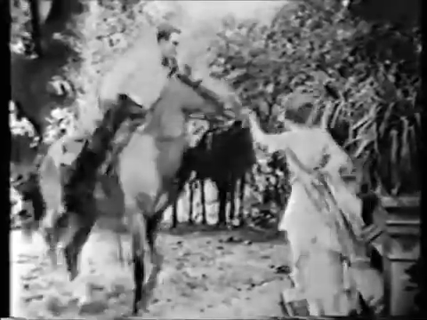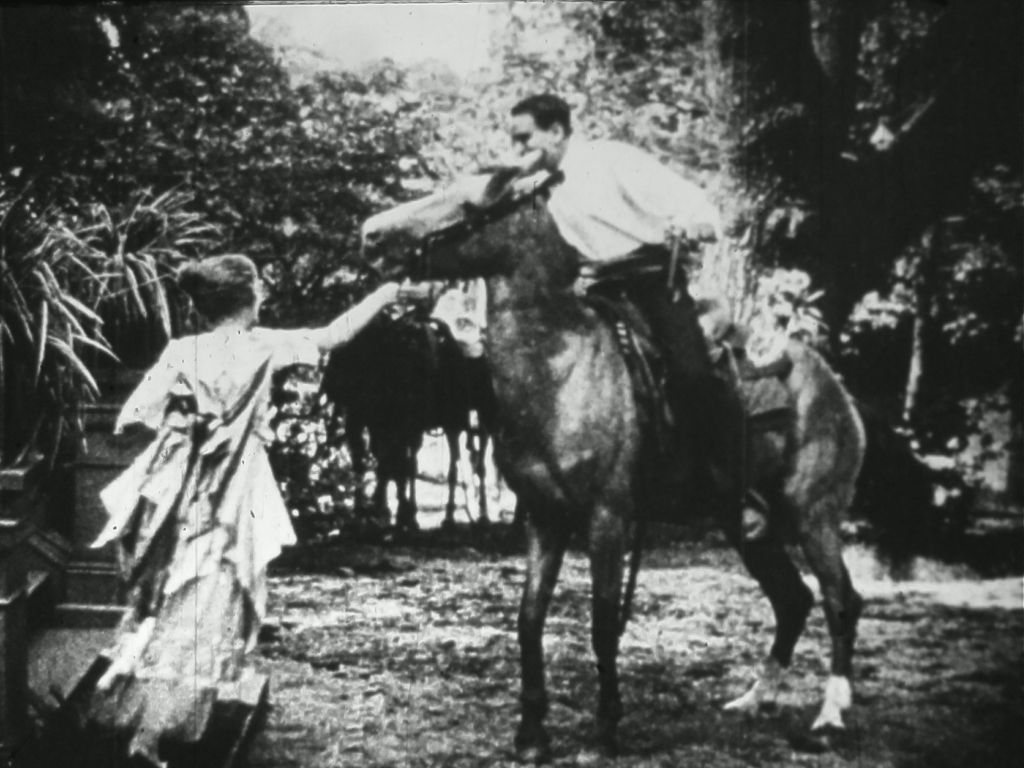 この中でやや特別な位置を占めていたのがジュエル・カーメンでした。 『ドーグラスの厭世』 『ドーグラスの飛行』『火の森』『ドーグラスの好奇』の4作でヒロイン役に抜擢。ロマンチックな場面でもお互いやりやすそうに演技していて相性の良さは際立っていました。本作でも幾つか見せ場があって、特に結末近くでフェアバンクスが乗った馬に引き上げられる一瞬の阿吽の呼吸は見事なものです。
