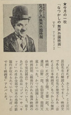 『音による日本映画史 なつかしの無声映画』(左)と『なつかしの無声外国映画』(中央)のオリジナル盤ジャケット。右は「映画情報」誌1974年5月号に掲載された後者のレビュー