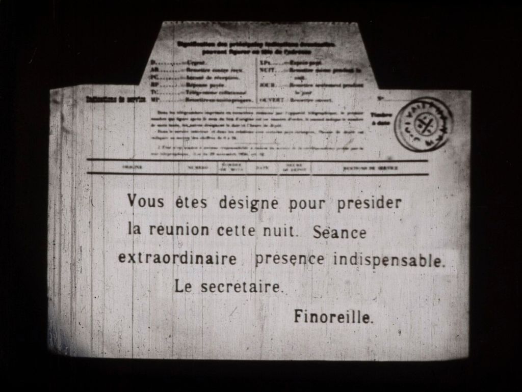 富裕層の夫婦が団欒を過ごしていた所に電報配達人が到着。電報には「今夜の会議で議長を務めてもらうことに相成り候。特殊案件につき出席必須なり。秘書フィノレィユより」の文面。夫は「仕事だからね」、寂しがる妻を抱きしめフロックコートを手に外出するのであつた。
