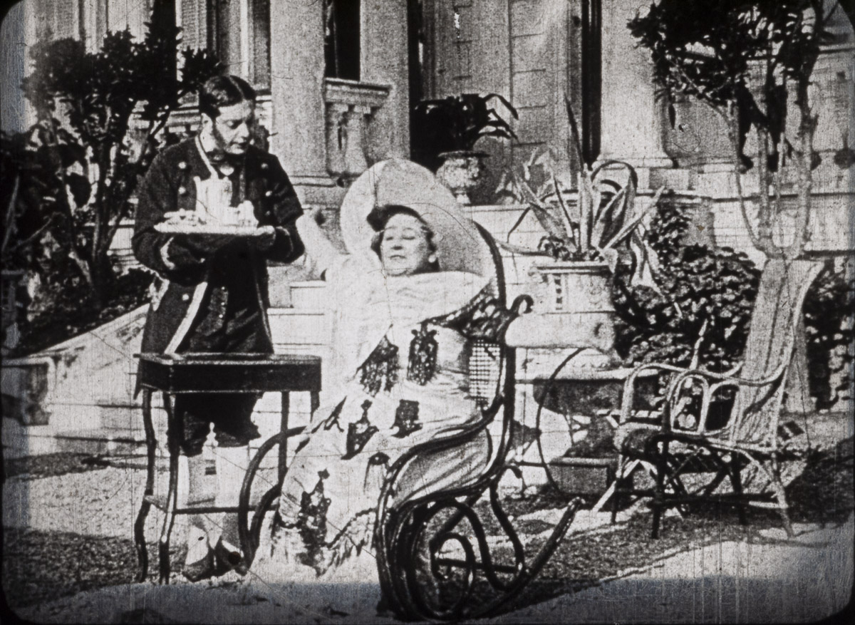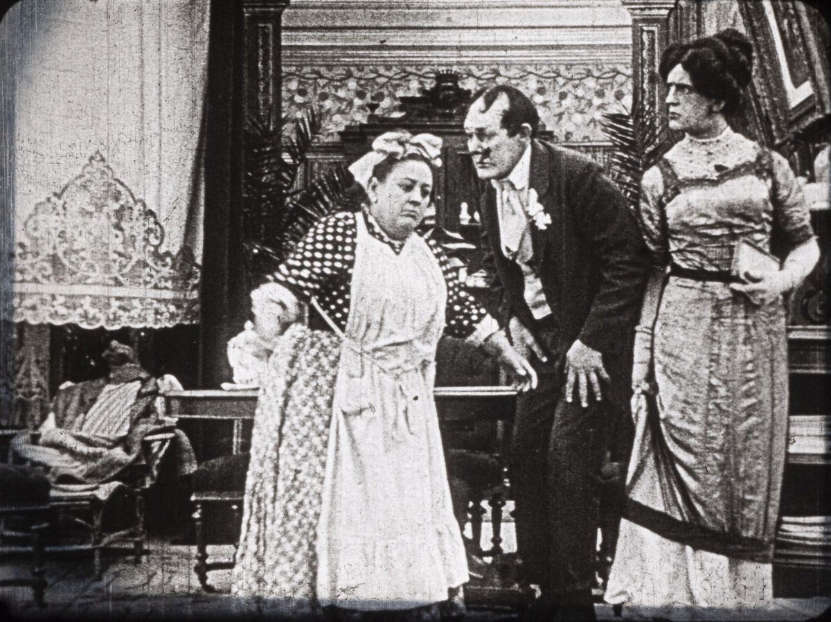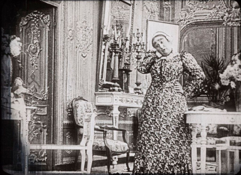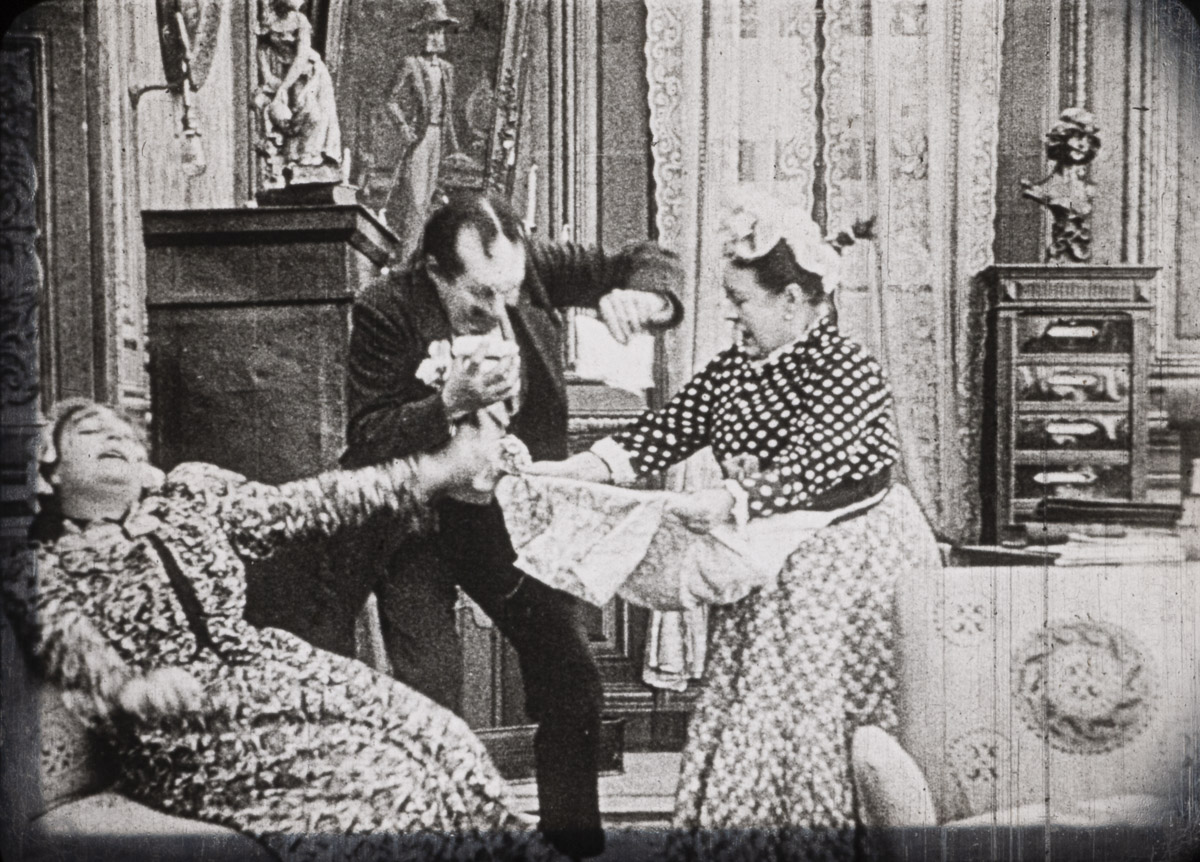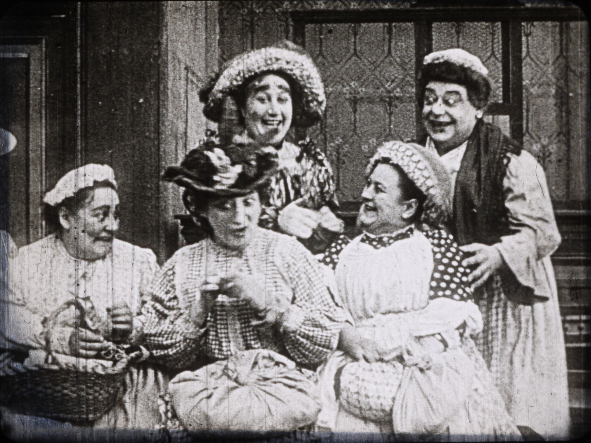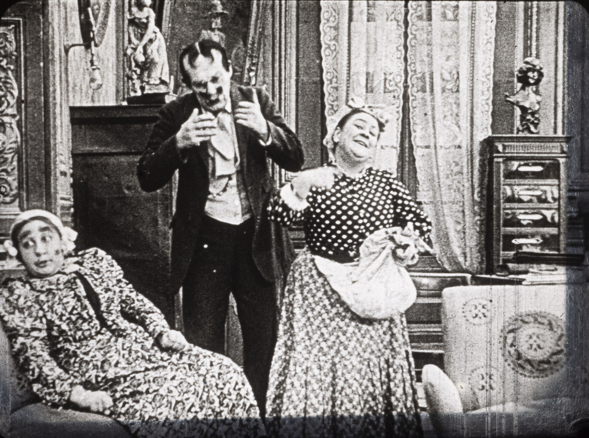 ほぼ全篇揃ってはいるものの冒頭のタイトル部、結末のクレジット部いずれも欠けていました。セリフや人間関係を説明する間字幕もなく若干特定に手間取ったものの、調査の結果1911年のパテ・フレール社作品で『ロザリーの沈黙は金』(Rosalie vend son silence)であると判明しました。第一次大戦前に人気のあった喜劇女優サラ・デュアメルを主演に配した一連の「ロザリー物」の一つに当たります。