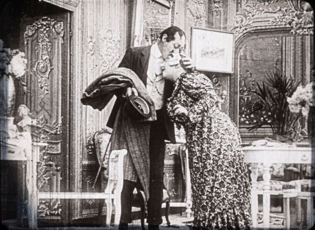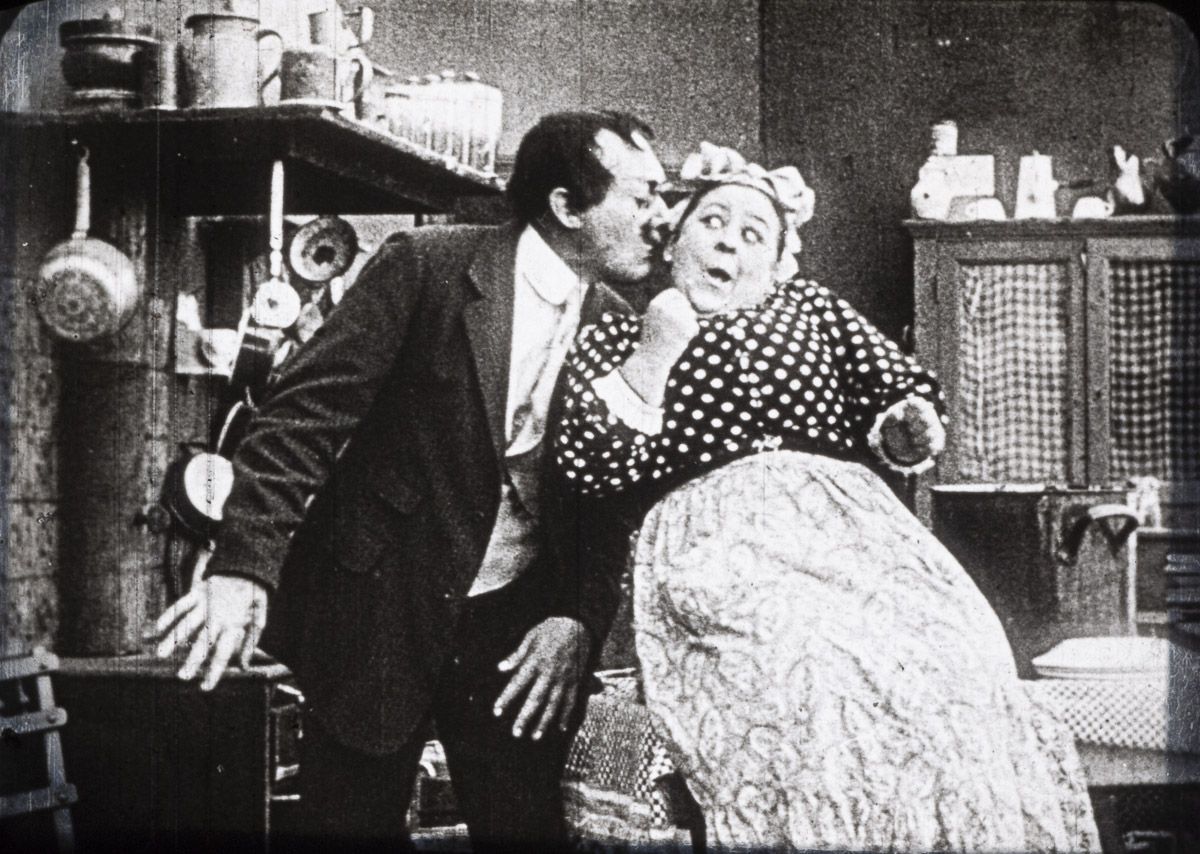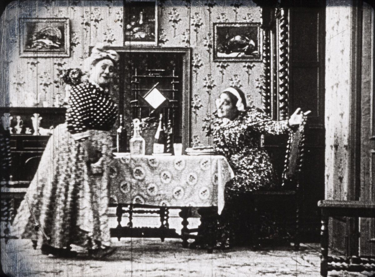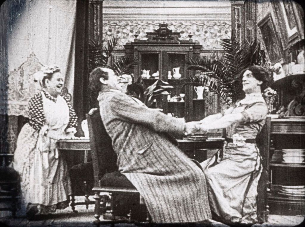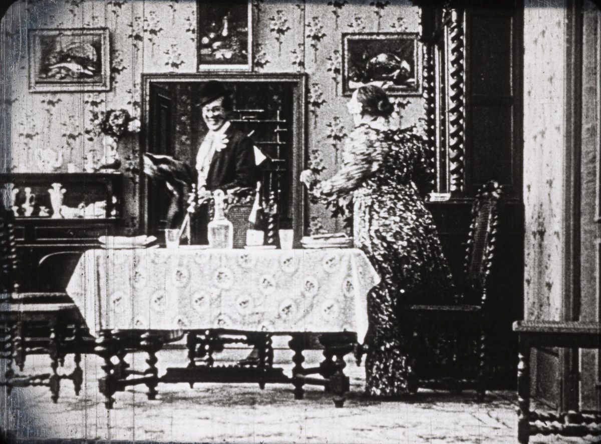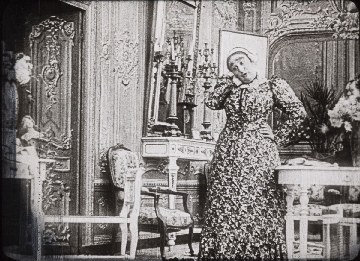 ほぼ全篇揃ってはいるものの冒頭のタイトル部、結末のクレジット部いずれも欠けていました。セリフや人間関係を説明する間字幕もなく若干特定に手間取ったものの、調査の結果1911年のパテ・フレール社作品で『ロザリーの沈黙は金』(Rosalie vend son silence)であると判明しました。第一次大戦前に人気のあった喜劇女優サラ・デュアメルを主演に配した一連の「ロザリー物」の一つに当たります。