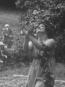 左は『巴里一九〇〇』(Paris Mille Neuf Cent)でのレジーナ・バデ。1910年に撮影されたもので、アントワーヌ座の楽屋で窓際に立ってカメラを見つめる短い動画。中央と右の二枚は同時期の屋外パフォーマンス動画より。