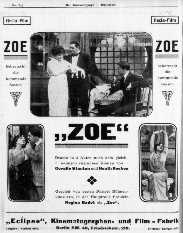 映画界での活動も同時期に開始し1910年『カルメン』で銀幕デビュー。1913年には英作家の小説を元にした『ゾーイ』で主演。同作は仏エクリプス社を通じて国外でも公開されています。その後もエクリプスが制作または配給に関わる形で『復讐譚(ヴァンデッタ)』『白き嘘』『サドゥナー』(1914年)、『金蓮』(1916年)、『マニュエラ』(1917年)に主演。