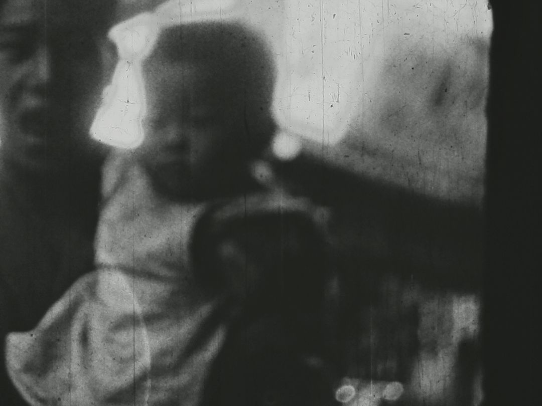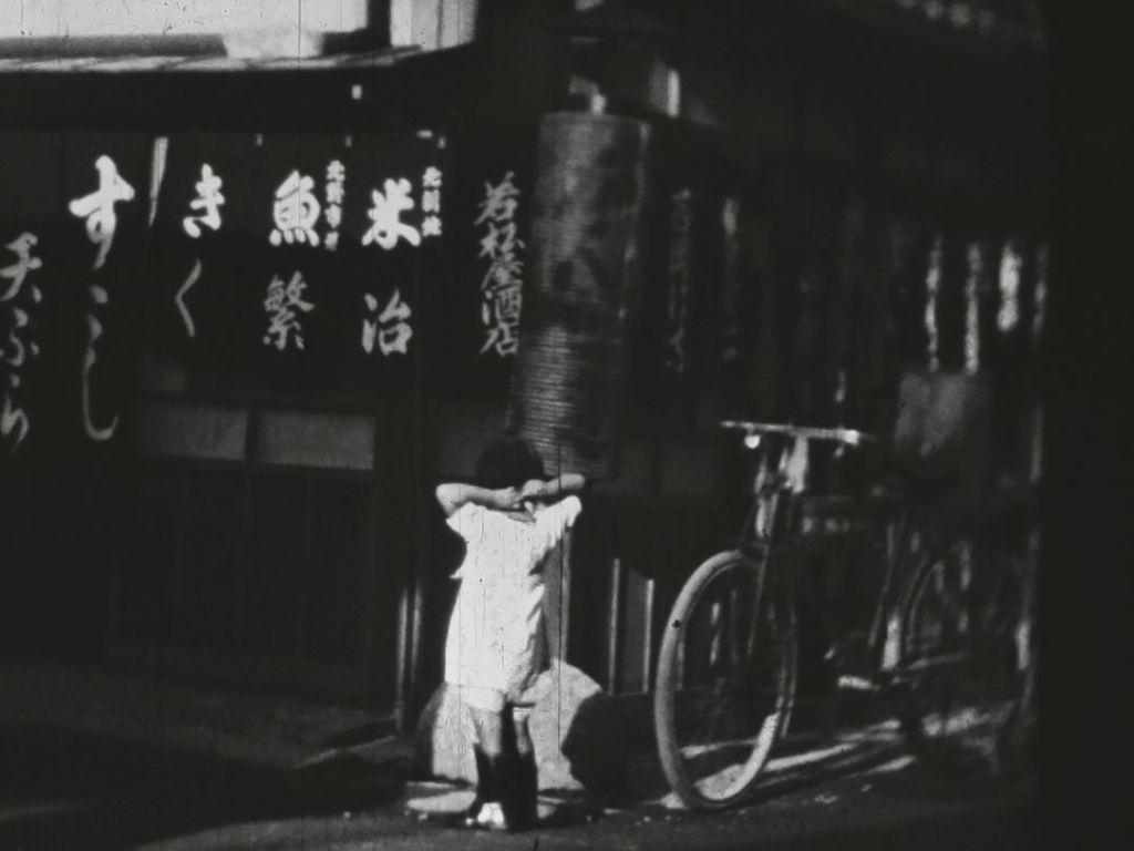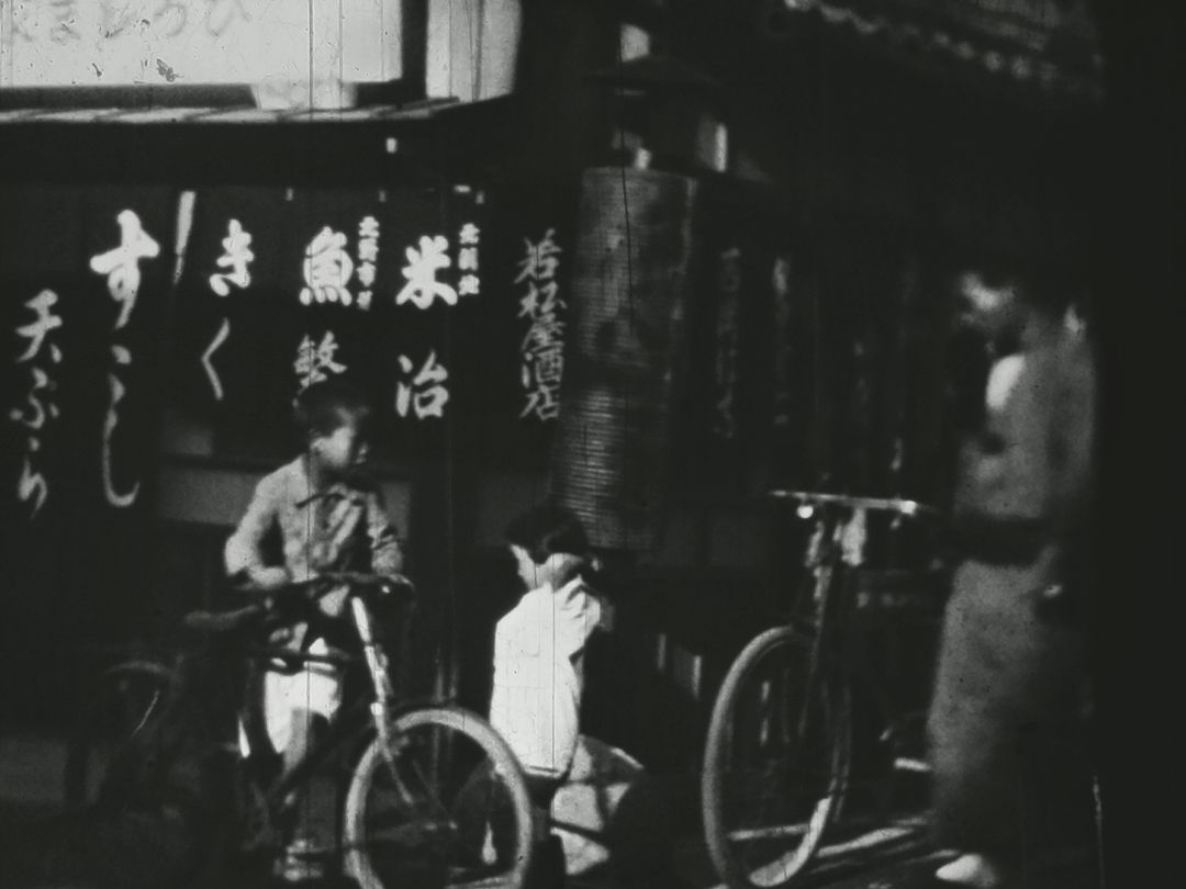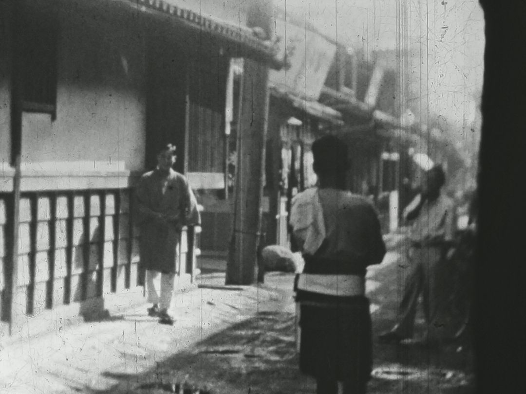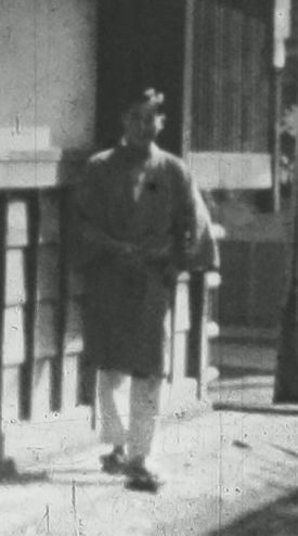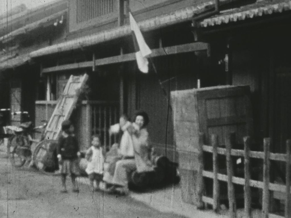 1)動画冒頭に子供さんをクローズアップで写した映像があって(3秒ほど)、その後屋外撮影に入っていきます。民家の軒先に撮影者・浅井氏の家族が勢揃い。日の丸が掲揚されているので祝日だったのでしょうね。奥さんが『御室行楽』と同じ動きで赤ん坊を高い高いしています。