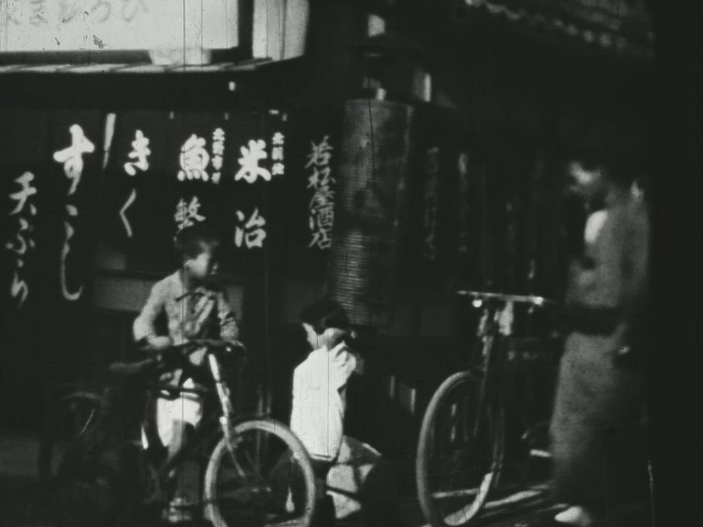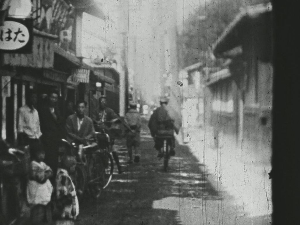 3)交差点から通りを撮らえた映像。角度を変えて数ショット撮影しています。左のスクリーンショットで店先の暖簾に「若松屋酒店」の文字を見て取ることができます。右の映像では商店前に人が集まっています。