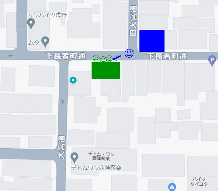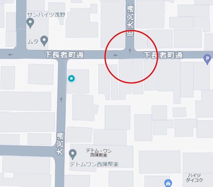 今回の動画はこの下長者町通と大宮通(現在の旧大宮通)が交わる一角を撮影場所としています。