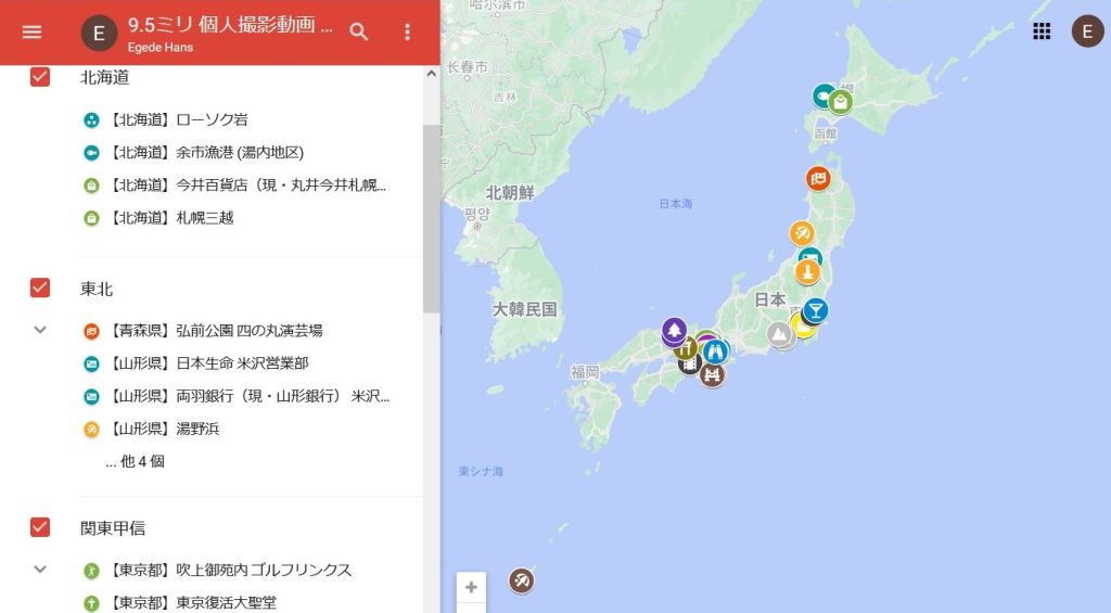 Googleマップのマイマップ機能を使い、手持ちの9.5ミリフィルムデータのマッピングに挑戦してみました。通常のGoogleマップ同様、画面左下の「+」「-」のクリック、またはマウスのホイールで縮尺を変えたり、地図内を検索したりすることができます。