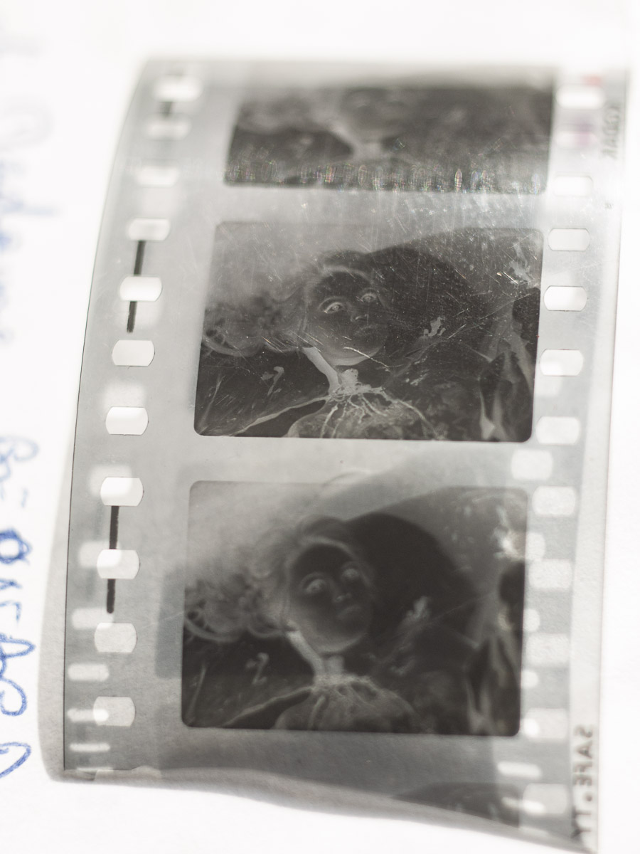 しかも『裁かるるジャンヌ』 の35ミリ断片が収められていた封筒には1958年に公開されたブリジット・バルドー主演作『可愛い悪魔(En Cas de malheur)』のネガが数枚収められていました。フィルムの切断の手癖が同一で、アンドレ・ベルナール氏が同時期に同経路で入手したと断定できます。名の知れた仏映画作品のポジやネガにアクセスできる人物が1958年以降に蒐集家向けに調達してきた断片で、その意味で両者とも(即ち『裁かるるジャンヌ』も)イタリアにあったプリントというよりフランスに現存していたプリントの可能性が高いと思われます。