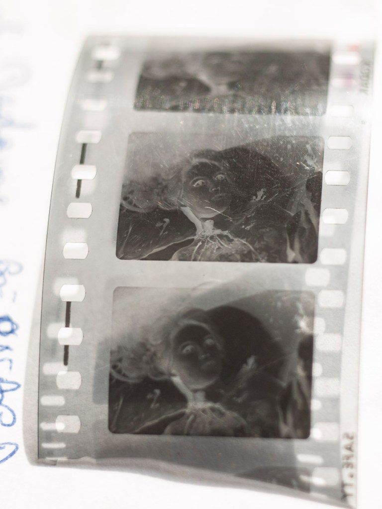 裏面には「ドライヤー監督のジャンヌ・ダルク/映画フィルム(Jeanne d’Arc de Dreyer / Pellicules de film)」の鉛筆書き。表面には「ベルナール夫妻(Monsieur et Madame Bernard)」とあります。この封筒に無造作に収められていたのが『裁かるるジャンヌ』の35ミリポジ断片でした。
