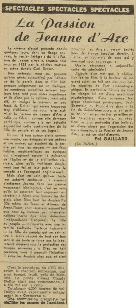 「シネマ・デッセ(Cinéma d’Essai)」 は1940年代末から50年代にかけ、リベラシオン紙の批評家ジャンデル主導で開催されていた映画配給・上映プロジェクトです。ロ・デュカ氏がこの人脈に近かったこともあり『裁かるるジャンヌ』新版はシネマ・デッセを通じて単館で上映が開始されました(1952年2月)。ピネル氏が「間にあわせ」と書いているように高いレベルの修復が行われた訳ではなく、音楽もロ・デュカ氏自身が趣味で選んだクラシック音楽をテープで流す程度のDIY感覚の強いものでした。