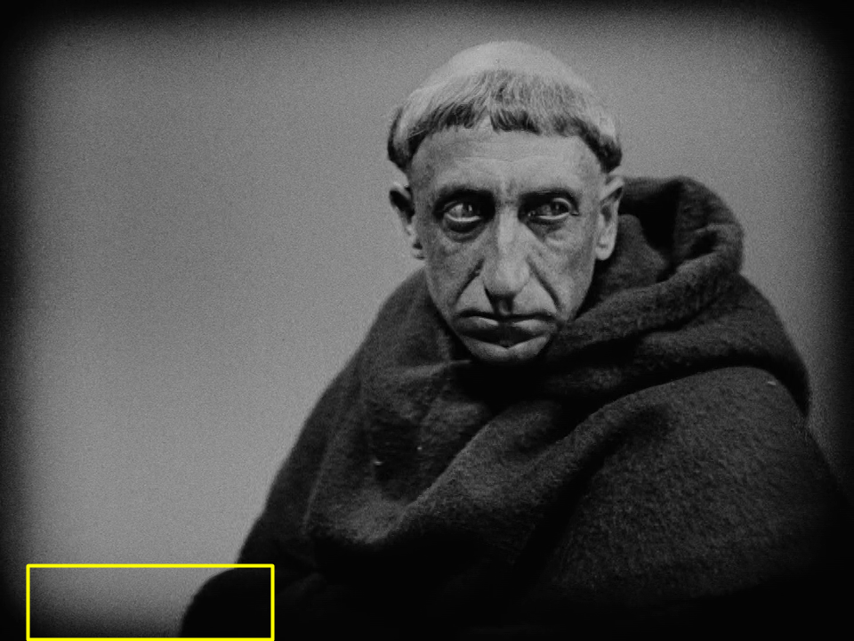 ジャン・マシュー(アントナン・アルトー)がジャンヌに火刑を告げた後、隣にいたラドヴニュ(パウル・ドゥロザック)が「臨終の聖体拝領を準備します」と声をかけ離れていく場面。同一のカメラで撮影されたものです。今回入手したプリントだとアルトーの右手親指は手のひらに握りこまれて見えない(左画像)のに対し、Aネガ由来のブルーレイ版では人差し指に添えるように外に出続けています(右画像)。