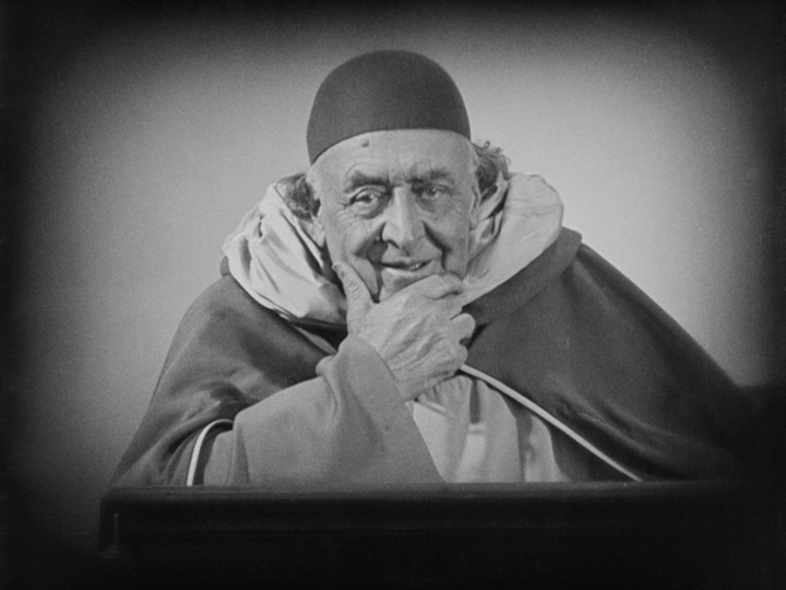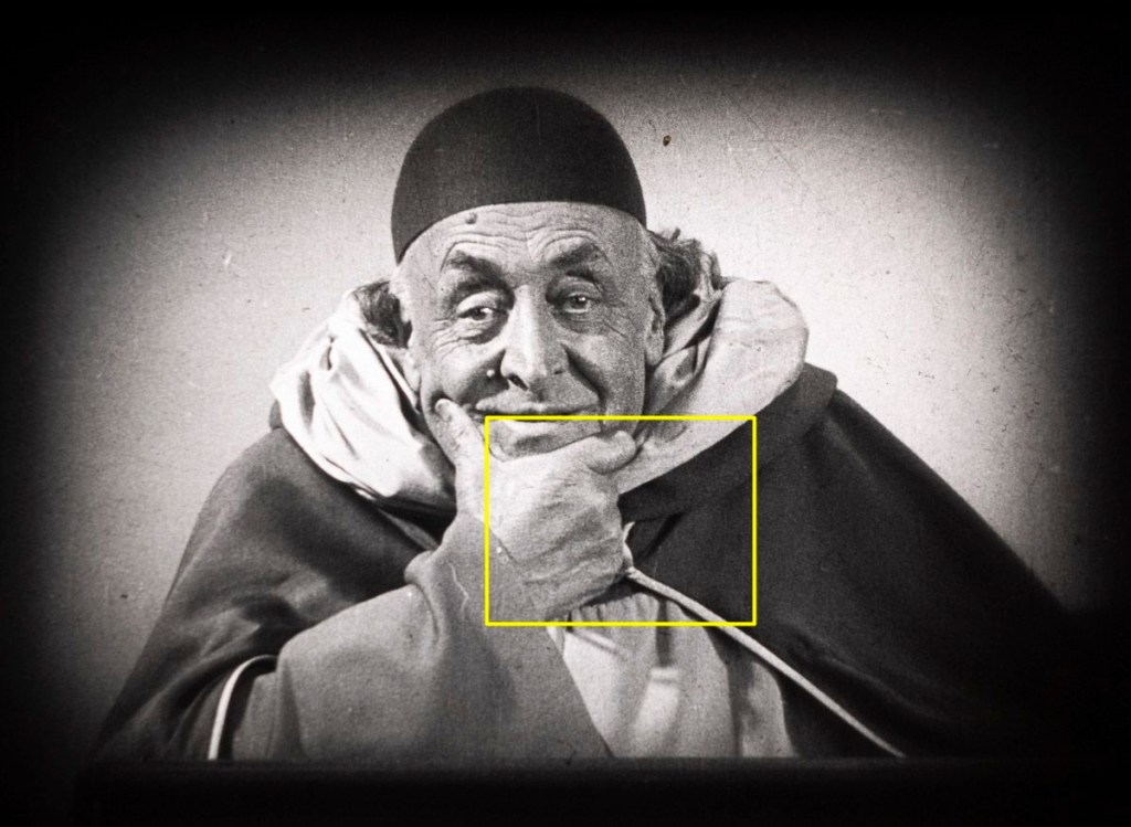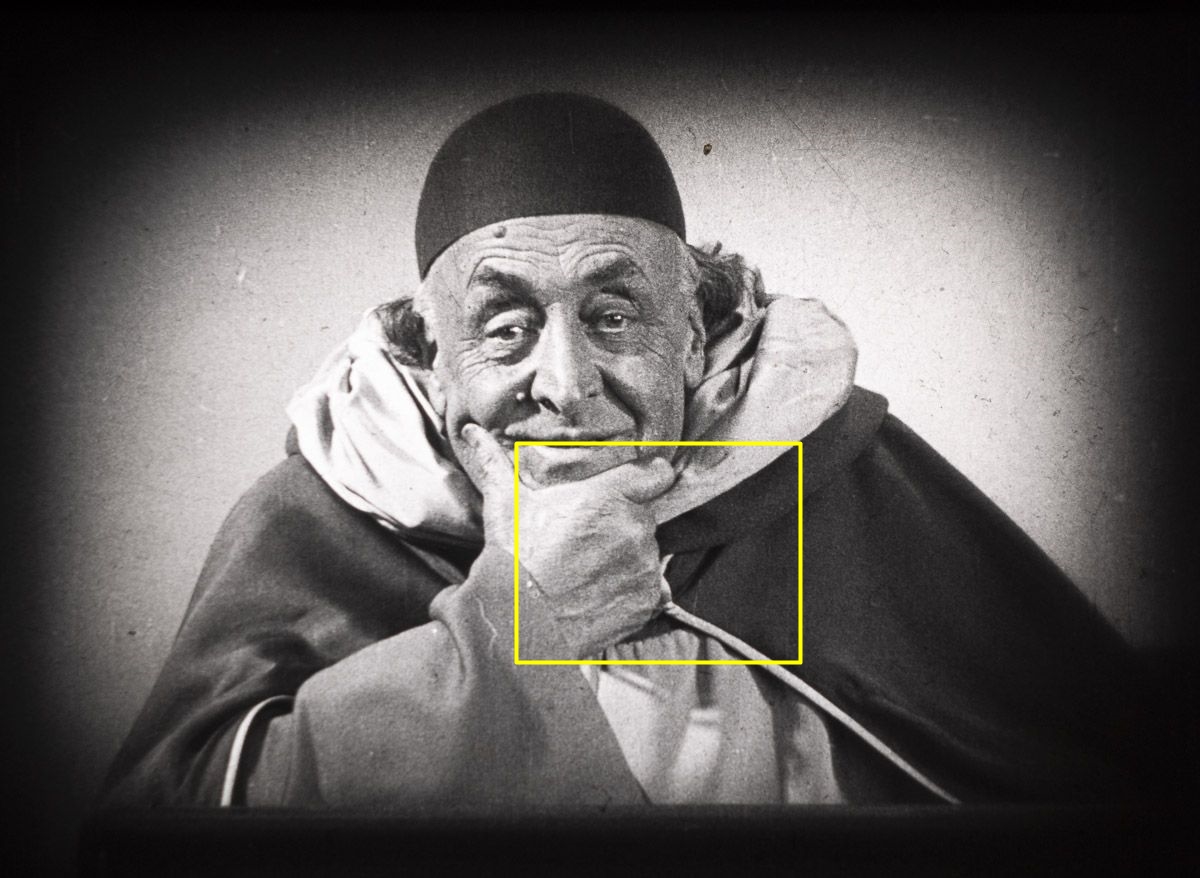 二番目の例はマシュー(アントナン・アルトー)がジャンヌに火刑を告げた後、隣に立っていたラドヴニュ(パウル・ドゥロザック)が「ミサの準備をします」と席を離れる場面。この瞬間、Aネガティヴではアルトーの右手親指が手のひらの外側に出ているのに対し、Bネガティヴでは手のひらの中に折りこまれて見えなくなっています。1999年松下電器&IVC版は親指が見えていますのでやはりAネガティヴ由来なのだと分かります。