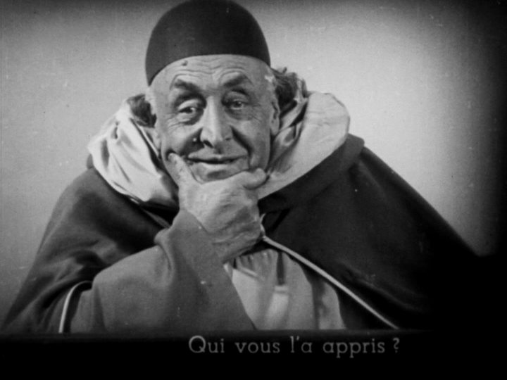 このプリントの正体はタイトル部の下に付された但し書きで明らかにされています。解像度が低く文字が潰れているものの「シネマネーク・フランセーズのご厚意により入手したプリントです(Acquired through the courtesy of the Cinémathèque française)」の一文を見ることが出来ます。