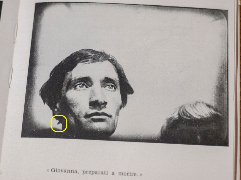 ところが4)オスロ版だけは形が違っています。うなじの背後に毛先が見えるのですが、先の3例とは違って二つの束に分かれていて角度も下向きになっています。AネガとBネガで髪型の細部に有意な変化が見られるという話で、パシネッティ版、ロ・デュカ版そしてアンドレ・ベルナール旧蔵版が同一のグループに属しBネガティヴから派生してきた証拠の一つとなっています。