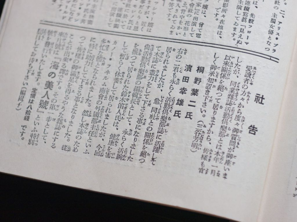 この号で一番興味深かったのは巻末近くに出されていた社告です。『活動倶楽部』で活動していた三谷芳明(=齋藤芳太郎)氏が年頭に同誌と縁を切り、それに併せて同誌同人であった桐野葉二・濱田幸雄両氏が籍を『活動花形』に移した旨が明記されています。また『活動倶楽部』元編集長の鈴木笛人氏も『花形』に協力するとのこと。