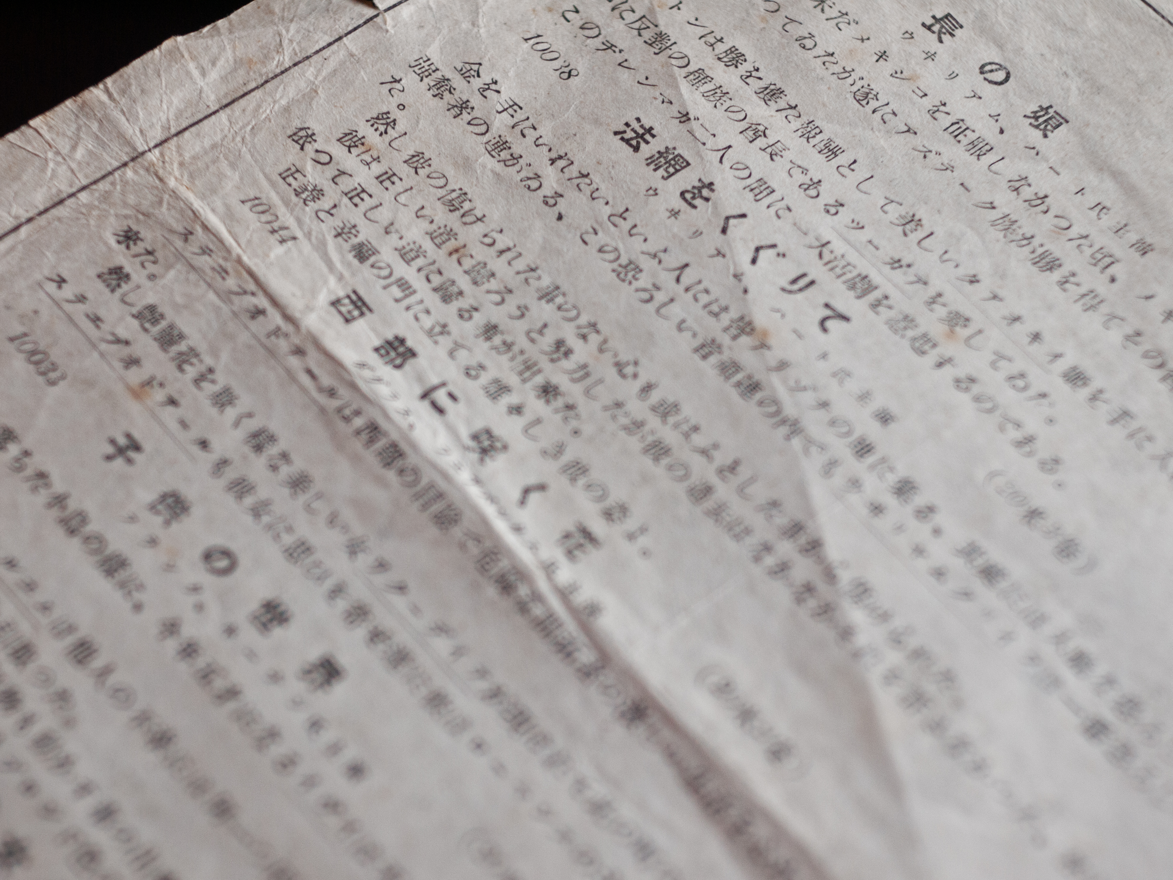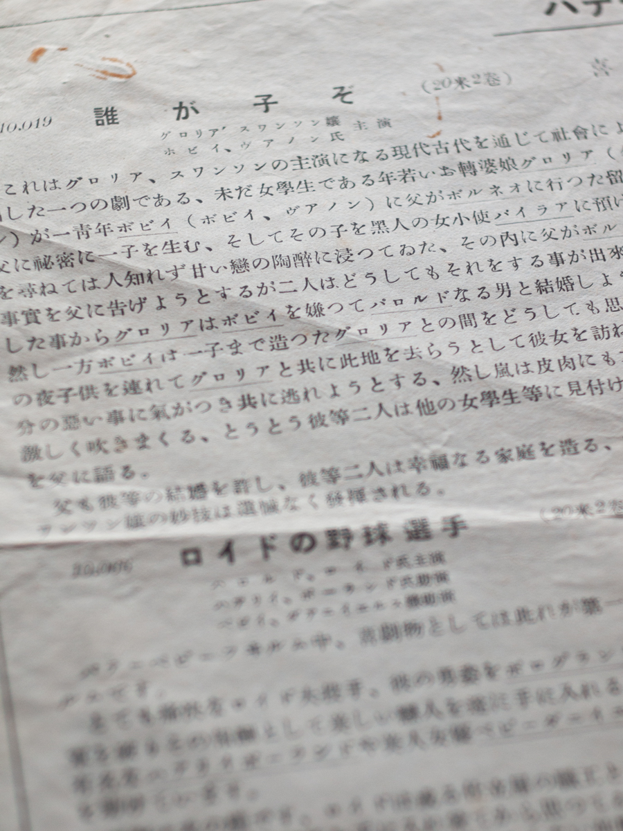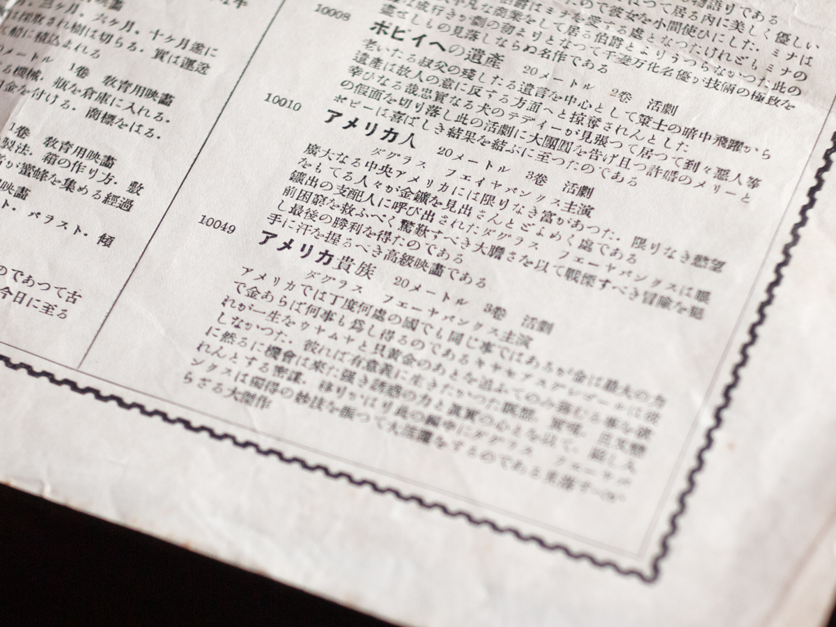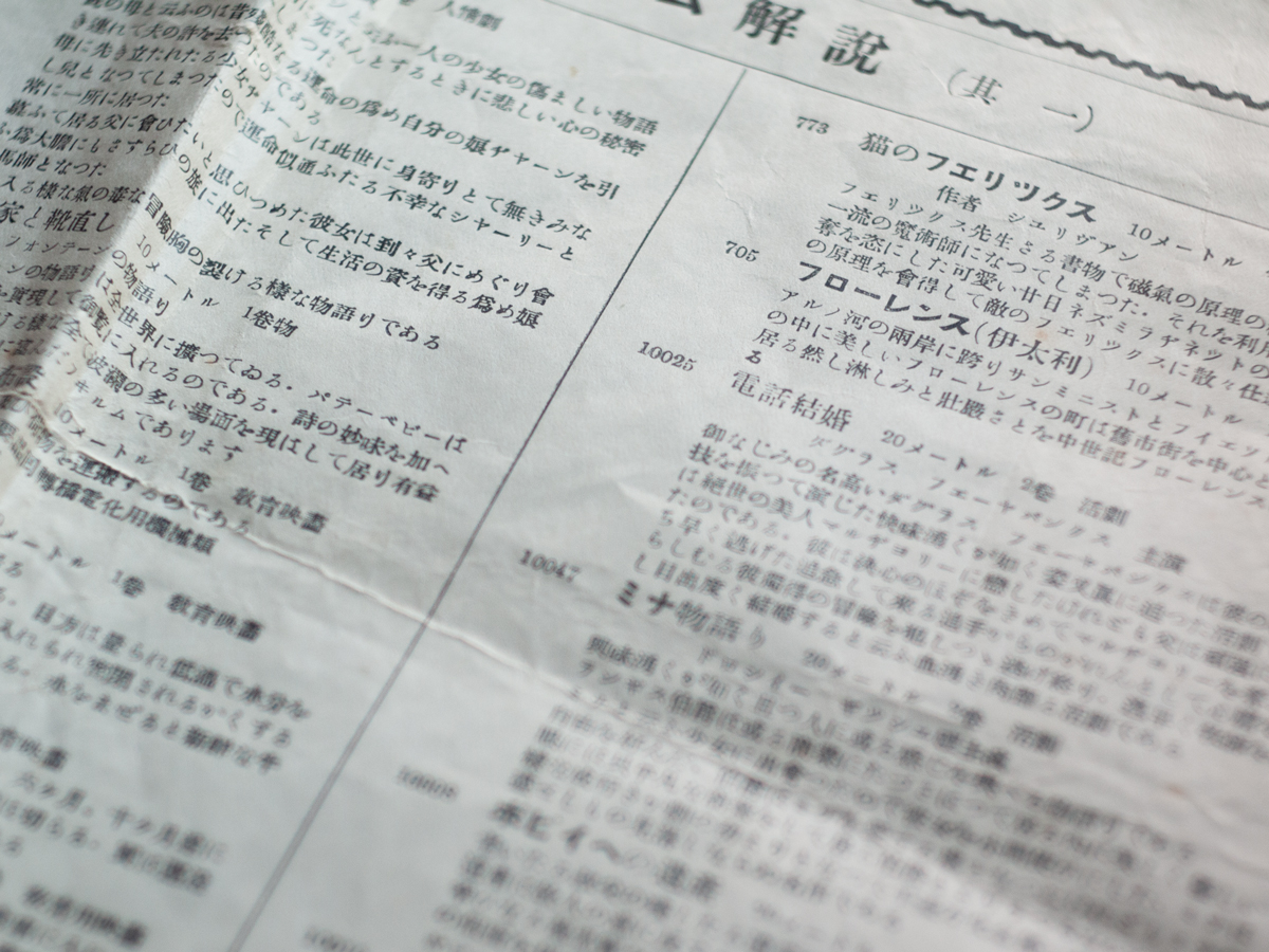 薄手の紙に印刷された日本語の9.5ミリフィルム解説。サイズがやや大きく26.8×38.5センチほどあります。
