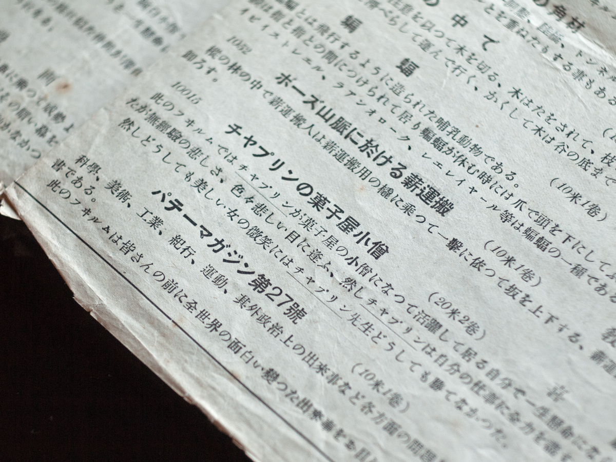 日本語による9.5ミリフィルム解説としては、個人愛好家の手による1『パテーベビーフヰルム解説書』(大正15年)があります。仏パテ社の初期の9.5ミリフィルムを網羅的に扱った力作ながら誤りが多く、また読みやすいとは言えない文章でした。今回入手した三枚の紙資料は言葉の選び方や説明の仕方が丁寧で、フィルムの長さやおすすめポイントも明記してあるなど販促用としてしっかりした内容になっています。作成者が明記されていないものの、伴野商店あるいはそれに類する取次店が制作したと思われます。
