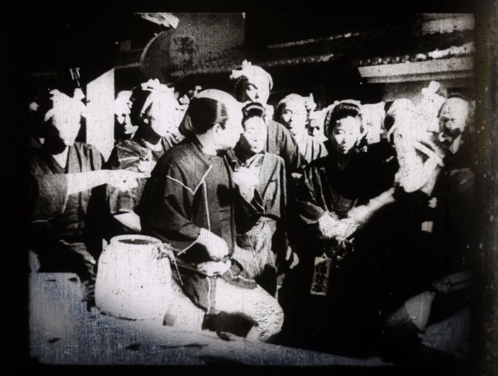 冒頭に登場する鉢巻姿の青年が魚屋の一心太助(藤原釜足)。城下町の大通り、別な魚屋と何かのきっかけで揉め事になり、体格の良い相手にボコボコに。鮮魚店の軒先で売られていた大きな蛸が触手を伸ばし、男の首筋から頭に絡みついてきます。