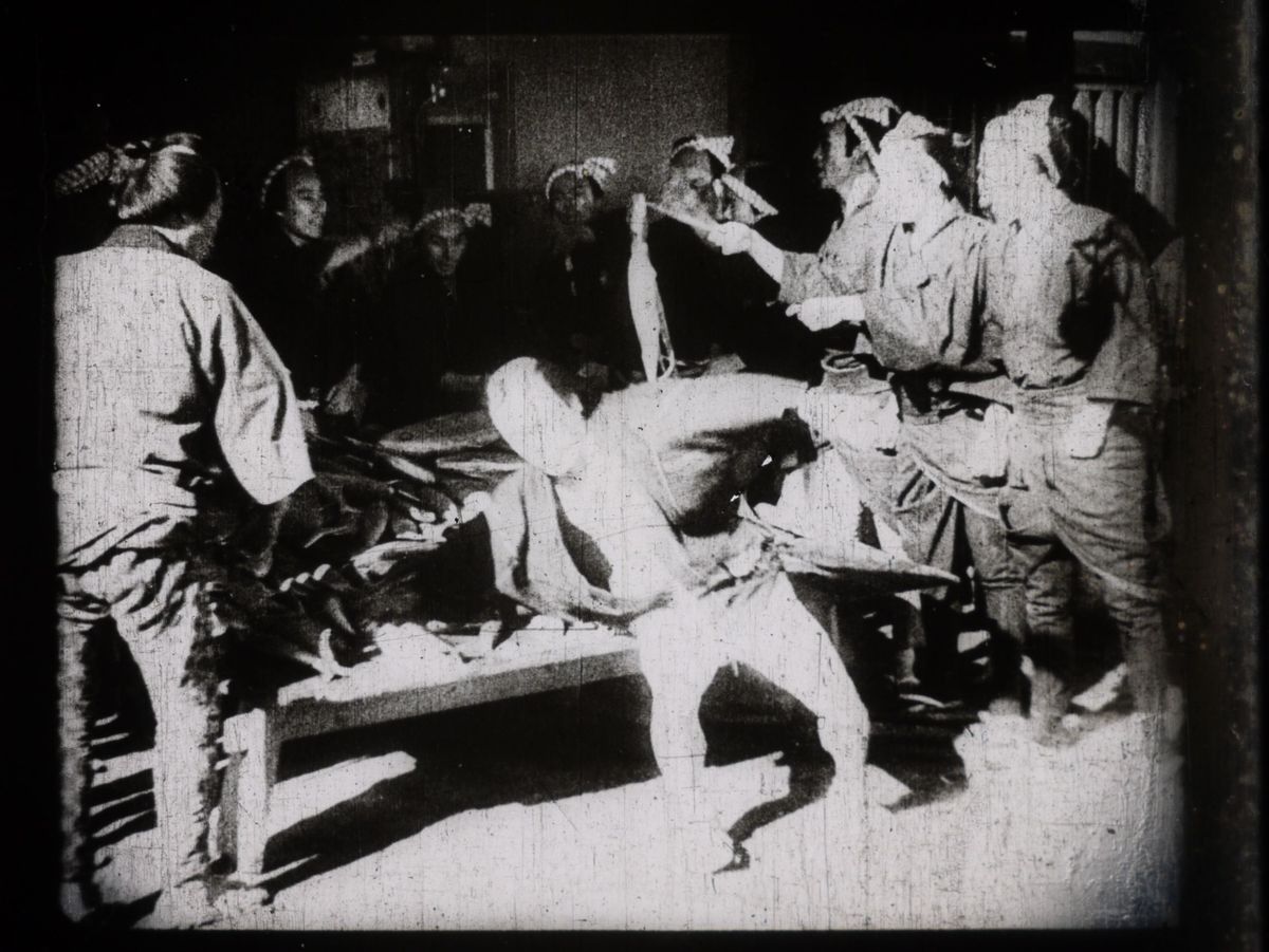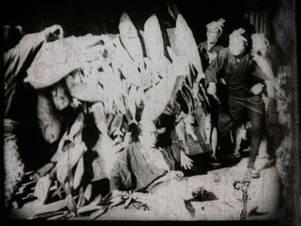 1939年公開作品『ロッパの大久保彦左衛門』より、彦左衛門による大蛸退治(?)と盥(たらい)による登城の章段。