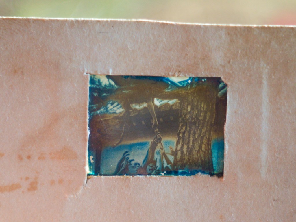 1910年~20年代に流通していた齣フィルムをどのように保管・運用していたかについては個人差が大きく、決して一律ではありませんでした。裸のままガサっと袋にひとまとめにしているケースもあれば、専用又は自家製のアルバムに並べている人もいる。窓を開けた厚紙で台紙を作り、光に翳して見て楽しむパターンは以前にも見たことがあって、コレクターの一部で共有されている手法だったと思われます。