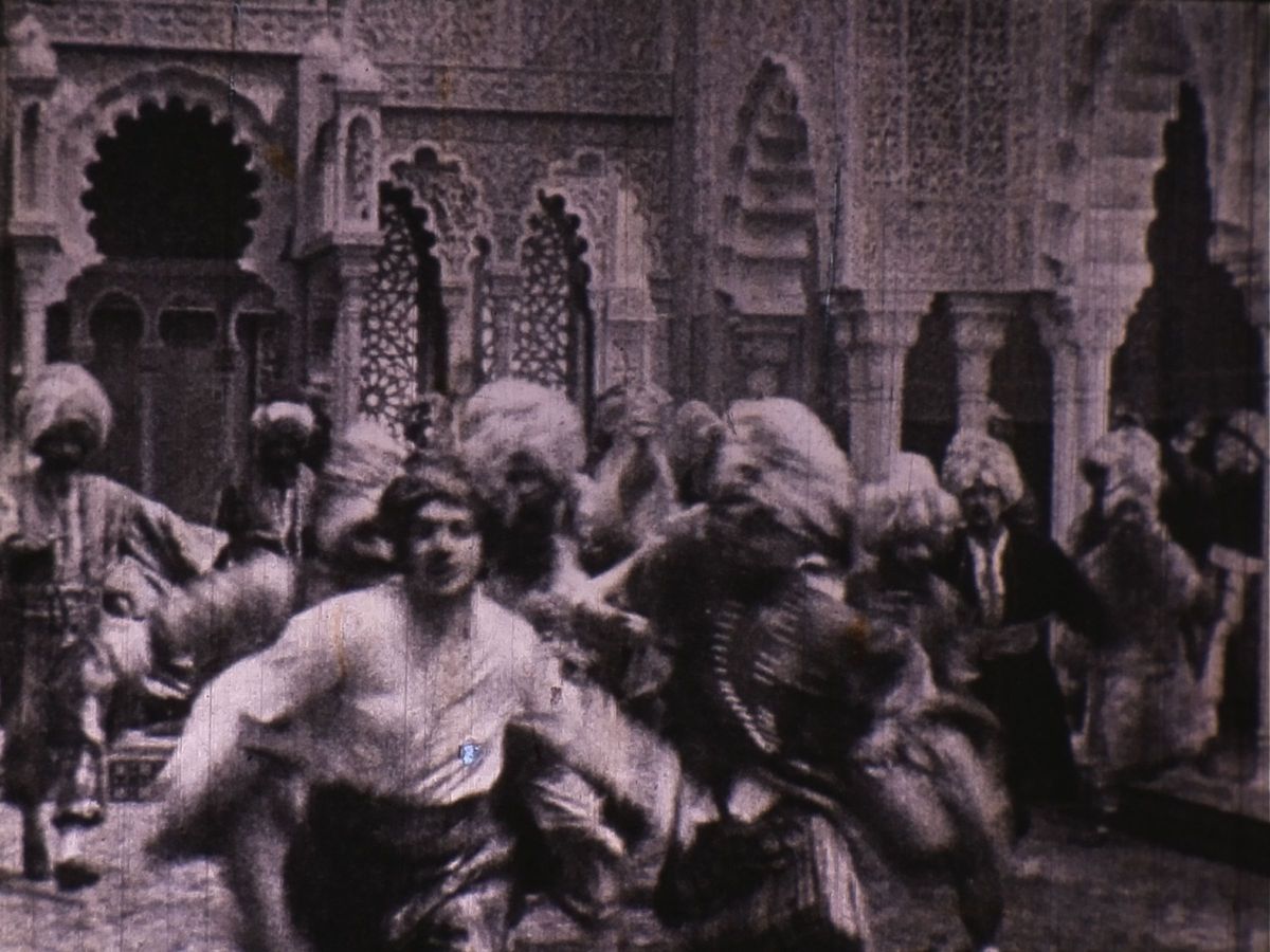 アルバトロス版『千一夜物語』はイスラム古典からエキゾチックな要素を借り受けつつ、そこにハリウッド流の活劇要素を混ぜあわせている点で興味深い一作です。作品中盤以降、ソレイマンは姫君救出のため剣を手に敵と戦い、建物の窓から飛び降り、椰子の木に登り、潜水し、炎を潜り抜ける八面六臂の活躍を見せます。フェアバンクスやパール・ホワイト活劇を念頭に置いたもので、欧州ではドイツのハリー・ピールを除くとこういった作品は作られていなかったため当時の観衆に新鮮な驚きを持って迎えられています。