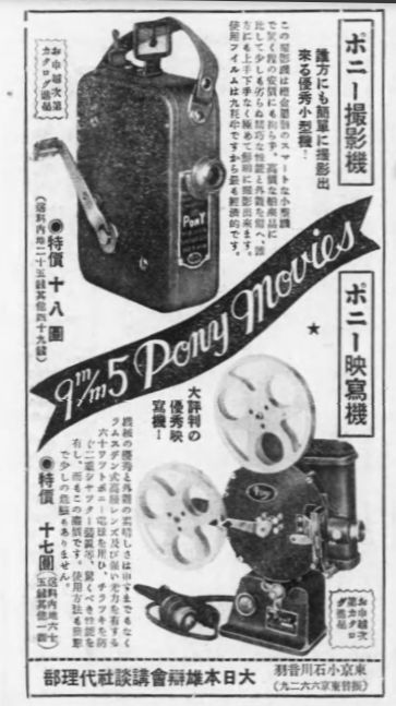ポニイ映畫機株式會社は1935年(昭和10年)6月に設立 [1] 、映写機、撮影機およびその付属品や周辺機器の販売を開始。この名称での活動期間は短く、翌年の秋(10月)には社名を日本映画機株式会社に変更、所在地を麹町区(現在の千代田区の一部)から日本橋の本町に移しています [2] 。手回し式(ポニイ撮影機)からゼンマイ式(エクセル撮影機)への移行に伴い、動画カメラは名称を変更しているのですが映写機はポニイブランドを継続して使用していきます。