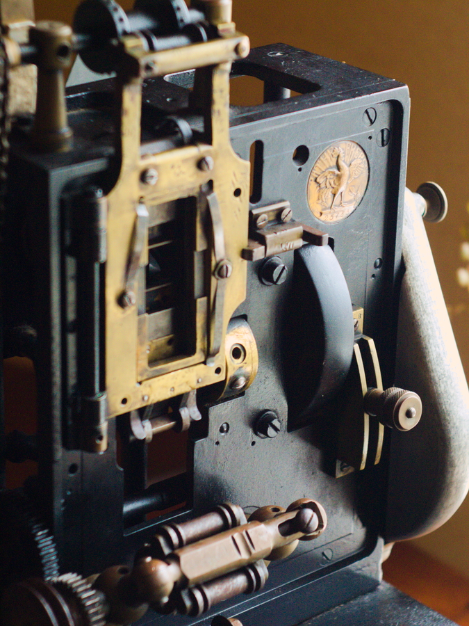 ハンドクランクは手持ちの部分のみ木製。クランクの根元、涙の形をした部分はマルタ十字のメカニズムを収めるケースになっています。逆側の側面はギア部になっていて、躯体上下に設置された歯付きのギアが連動して動くことでフィルムを安定して送ることができます。この辺の発想は形を変えて1920年代のパテベビー映写機にも受け継がれていきます。